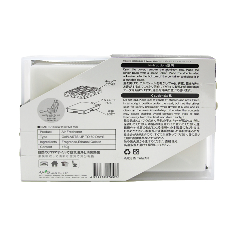 - Hộp thơm khử mùi AIR-Q KIRICO BOX II NO.239-3 Fantasy Musk 160g được chế tạo với công thức đặc biệt của các chuyên gia hàng đầu tại Đài Loan, với hương xạ nhẹ nhàng giúp bạn thư giãn thoải mái, tăng khả năng tập trung khi tham gia giao thông. Thiết kế nhiều mặt cắt dạng kim cương vừa hỗ trợ lan toả mùi hương tốt hơn vừa tạo nét chấm phá nổi bật trong không gian Công dụng của Hộp thơm khử mùi AIR-Q KIRICO BOX II NO.239-3 Fantasy Musk 160g