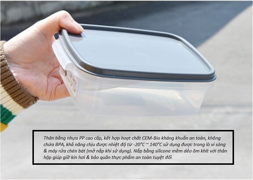 ● Chất liệu: Thân bằng nhựa PP cao cấp, kết hợp hoạt chất CEM-Bio kháng khuẩn an toàn, không chứa BPA, khả năng chịu được nhiệt độ từ -20°C ~ 140°C sử dụng được trong lò vi sóng & máy rửa chén bát (mở nắp khi sử dụng). Nắp bằng silicone mềm dẻo ôm khít với thân hộp giúp giữ kín hơi & bảo quản thực phẩm an toàn tuyệt đối