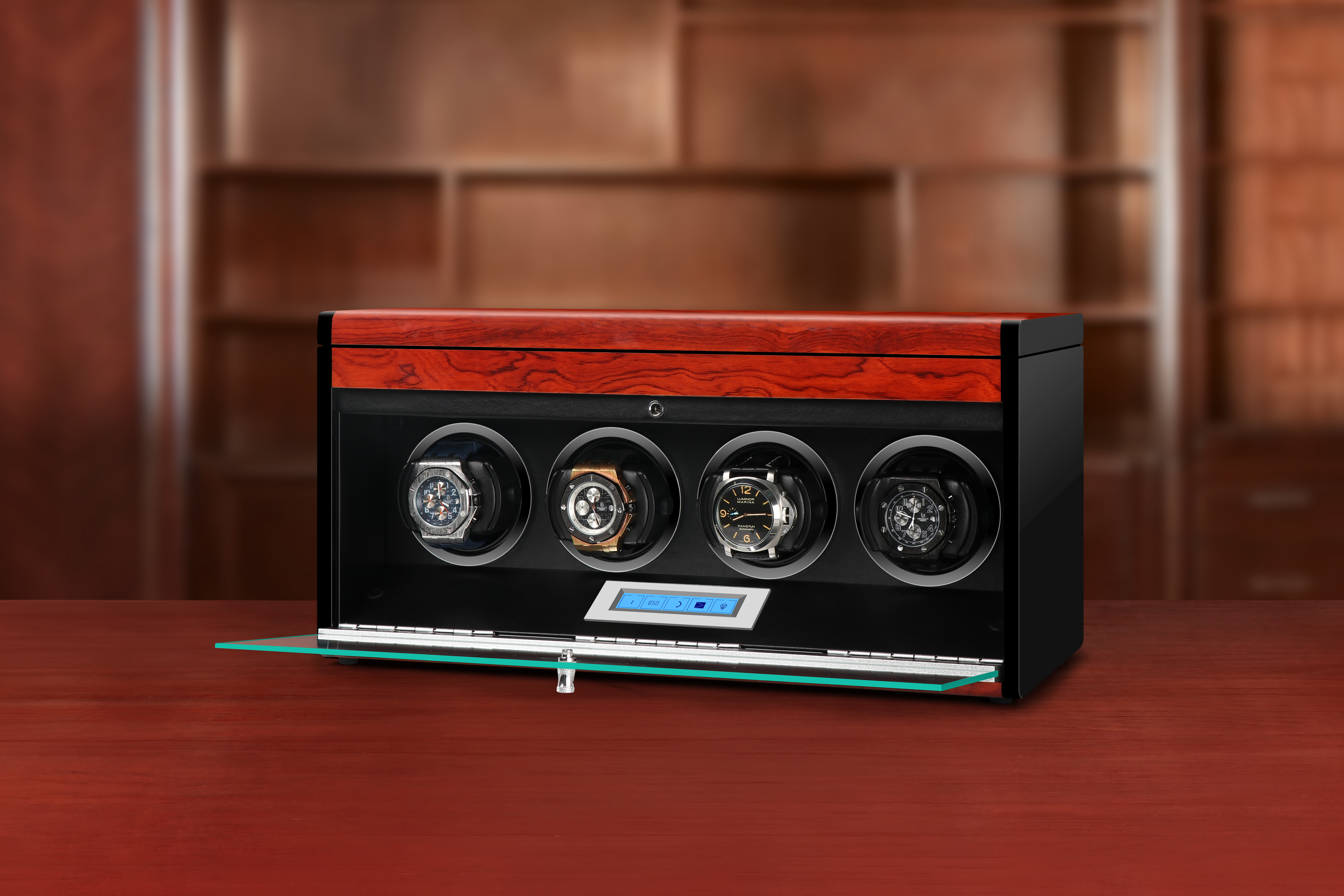 Mua tại Tiktok• Mã sản phẩm: DRT4 • Số lượng đồng hồ 04 xoay + khay trên để đồng hồ pin và phụ kiện • Kích thước: 43.51921cm (Dài x Rộng x Cao) • Trọng lượng: Thiết bị: 5.8kg / Đóng gói: 6.8 kg. • Màu sắc: ĐEN / VÂN GỖ ĐỎ • Chất liệu: Gỗ MDF mật độ cao chống ẩm mốc • Động cơ: Chính hãng DRIKLUX • Nút nguồn phụ hỗ trợ dừng xoay khi mở nắp. • Bảng LED điều khiển cảm ứng • Đèn Led chiếu sáng ổ xoay. • Có thể thiết lập riêng biệt cho từng ổ xoay. • Thương hiệu của ĐỨC – Nhà máy sản xuất tại Trung Quốc