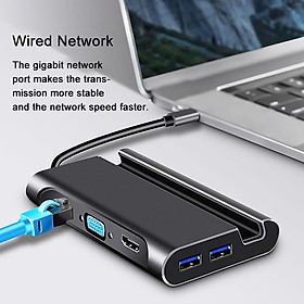 1.Features: USB-C to HDMI, VGA, USB, SD/TF expansion hub, PD Charge, Lan 2.Input: USB Type-C 3.Output: HDMI 4K@30Hz, VGA 1080P, USB-A 3. x3, SD/TF, LAN 1Gbps, 4.HDMI resolution: 4K@30Hz 5.VGA resolution: 1080P 6. USB Speed: