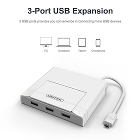 Mua tại TiktokHub USB 2.0 3 Ports + LAN + OTG Dock Unitek (Y - 2175) Hub USB hỗ trợ 3 cổng USB 2.0 với tốc độ 480 Mbps. Chip xử lý FE1.1S + AX88772C. Tích hợp