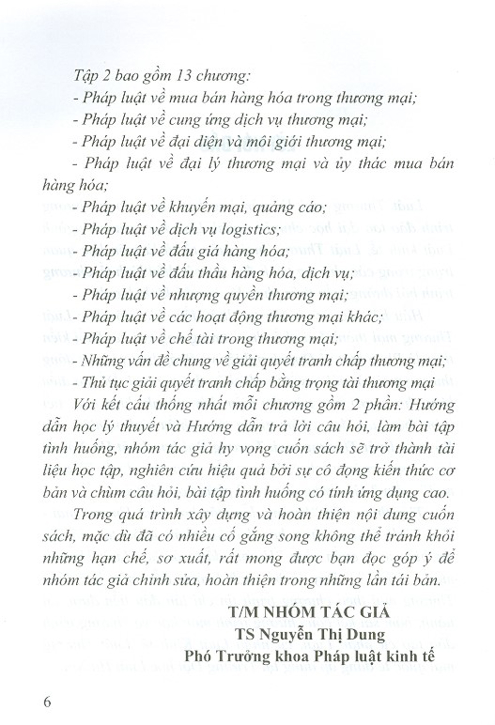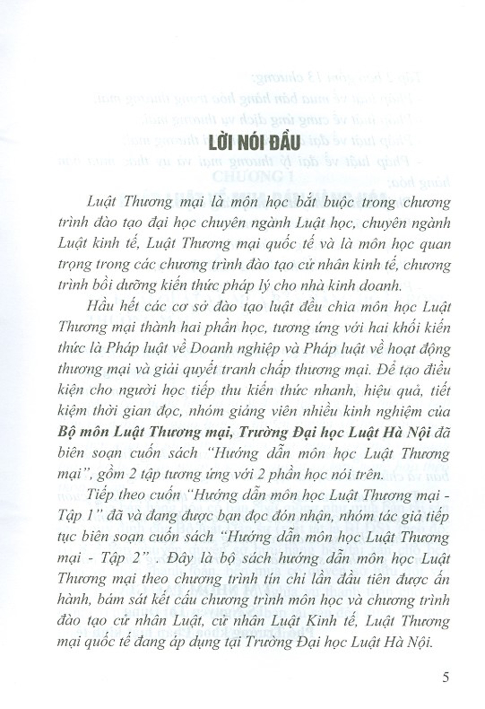 Hầu hết các cơ sở đào tạo luật đều chia môn học Luật thương mại thành 2 phần học, tương ứng với 2 khối kiến thức là pháp luật về Doanh nghiệp và pháp luật về hoạt động thương mại và giải quyết tranh chấp thương mại. Để tạo điều kiện cho người học tiếp thu kiến thức nhanh,hiệu quả,tiết kiệm thời gian đọc,nhóm giảng viên nhiều kinh nghiệm của Bộ môn luật thương mại, trường Đại học Luật Hà Nội đã biên soạn cuốn sách "Hướng dẫn môn học luật thương mại" gồm 2 phần học tương ứng với 2 phần học nói trên