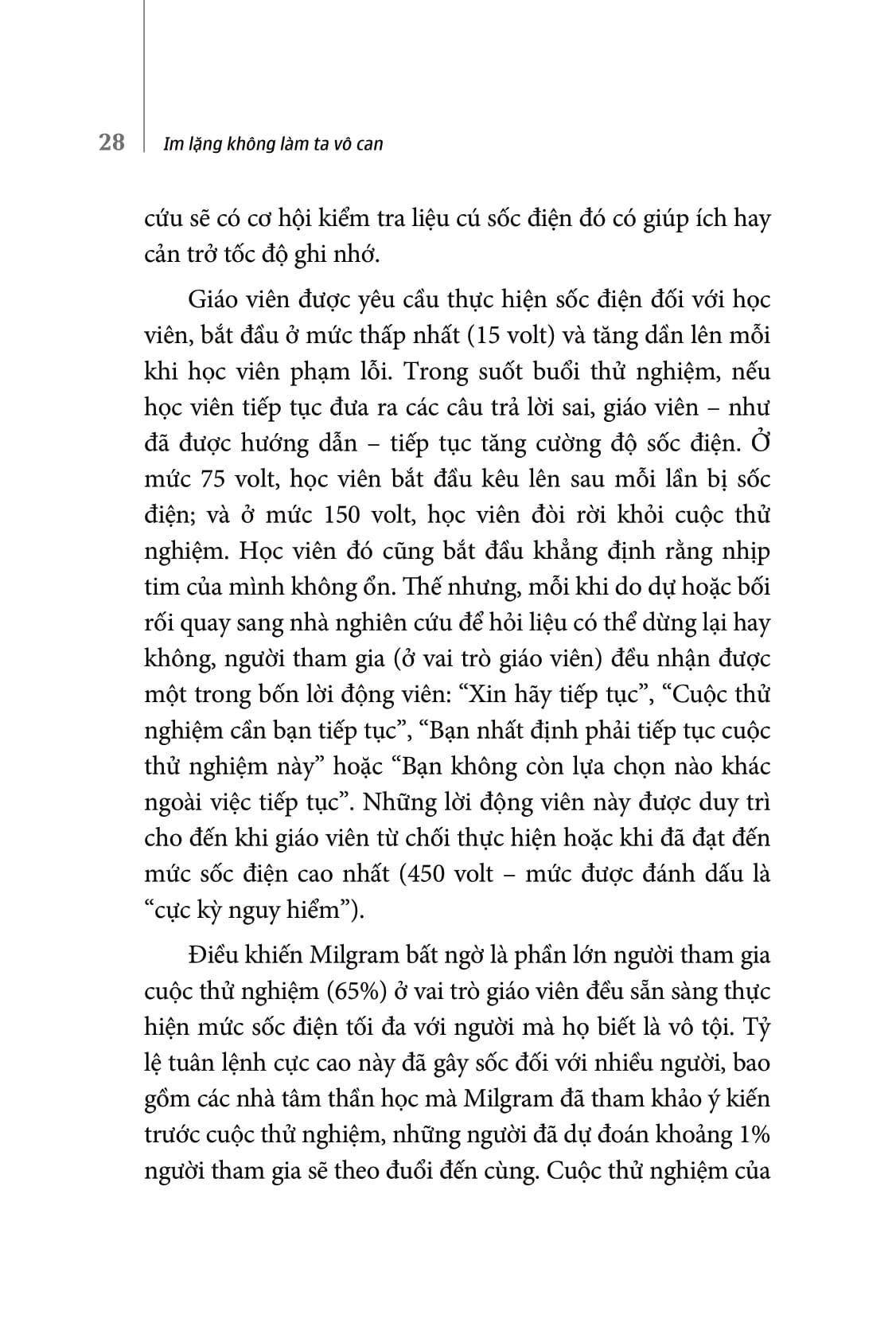 Hy vọng rằng, qua việc nhìn sâu vào những nguồn cơn và đưa ra các phương cách thiết thực để chống lại áp lực khi đối diện với hành vi xấu trong cuộc sống, độc giả có thể chống lại bản năng im lặng để lên tiếng và hành động đúng đắn ngay cả khi cảm thấy thật khó khăn. Như Albert Einstein từng nói: “Thế giới này là một môi trường sống nguy hiểm, không phải bởi những kẻ ác mà bởi những người khoanh tay làm ngơ trước cái ác”.