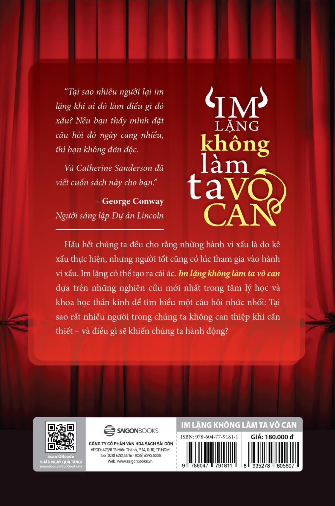 Im lặng không làm ta vô can dựa trên những nghiên cứu mới nhất trong tâm lý học và khoa học thần kinh của tác giả Catherine Sanderson để tìm hiểu một câu hỏi nhức nhối: Tại sao rất nhiều người trong chúng ta không can thiệp khi cần thiết - và điều gì sẽ khiến chúng ta hành động? Mục đích của Catherine Sanderson khi viết cuốn sách này là để giúp mọi người hiểu về các yếu tố tâm lý làm nền tảng cho xu hướng im lặng rất tự nhiên của con người khi đối mặt với hành vi xấu và cho thấy sự im lặng có vai trò quan trọng như thế nào trong việc cho phép hành vi xấu tiếp diễn.