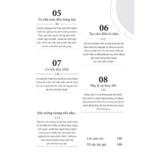 Về bản chất, cuốn sách là một bức thư tình gửi tới tiềm năng con người – là lời ngợi ca những gì mà chúng ta, với tư cách một giống loài trên Trái đất, có khả năng làm được và trở thành nếu được tạo những điều kiện phù hợp. Cuốn sách đề cập ba chủ đề chính. Thứ nhất, chúng ta đang sống trong thời đại mang tính cách mạng và phải đối mặt với những thách thức chưa từng có tiền lệ – ở cả tư cách cá nhân, cộng đồng hay một giống loài. Những thách thức ấy phần nhiều đều do chúng ta tự gây ra. Điều đó cũng có nghĩa là ta có thể làm gì đó để ngăn cản chúng. Thứ hai, nếu muốn làm điều đó, chúng ta cần nghĩ khác đi về con trẻ cũng như bản thân mình. Thứ ba, ta cần làm mọi việc theo cách khác cả trong giáo dục, trong công việc và trong cộng đồng.