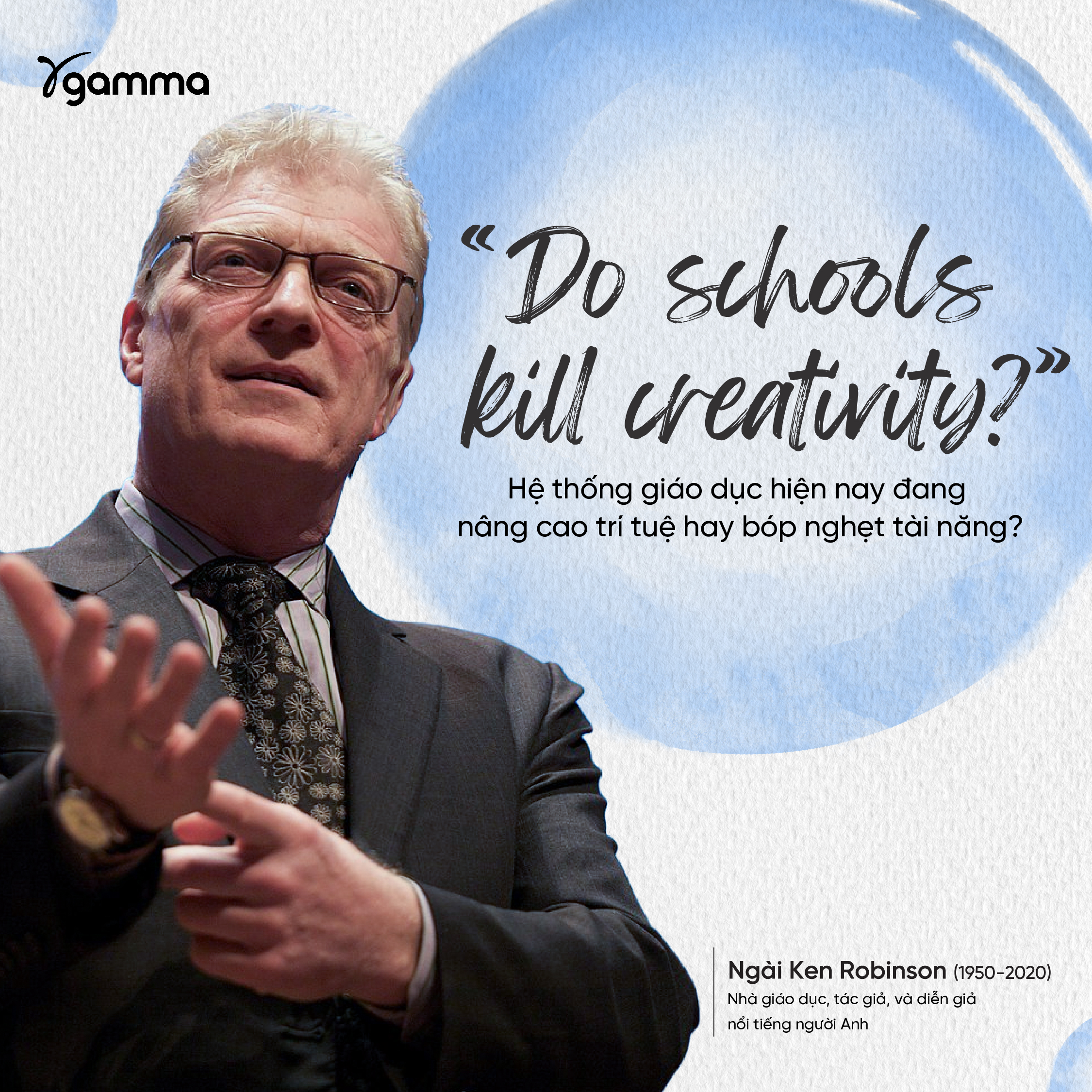 Sir Ken Robinson (1950-2020) là chuyên gia toàn cầu về sáng tạo, giáo dục và tiềm năng con người. Ông là tác giả bán chạy của The New York Times với các đầu sách đã được dịch ra 24 ngôn ngữ. Bài nói chuyện mang tính đột phá của ông trên TED Talks, Do Schools Kill Creativity (Trường học có giết chết sự sáng tạo), đến nay vẫn thu hút hàng chục nghìn lượt xem mỗi ngày. Đây là con số mà theo Chris Anderson, Giám đốc TED, tương đương với việc bán hết vé cho Millennium Dome mỗi đêm trong 15 năm liên tiếp. Ông đã hợp tác với các nhà lãnh đạo, nhà giáo dục và các tổ chức trên thế giới để ủng hộ vai trò của sáng tạo trong học tập và cuộc sống. Những hiểu biết sâu sắc của ông đã định hình các chính sách và hoạt động giáo dục trên toàn thế giới.