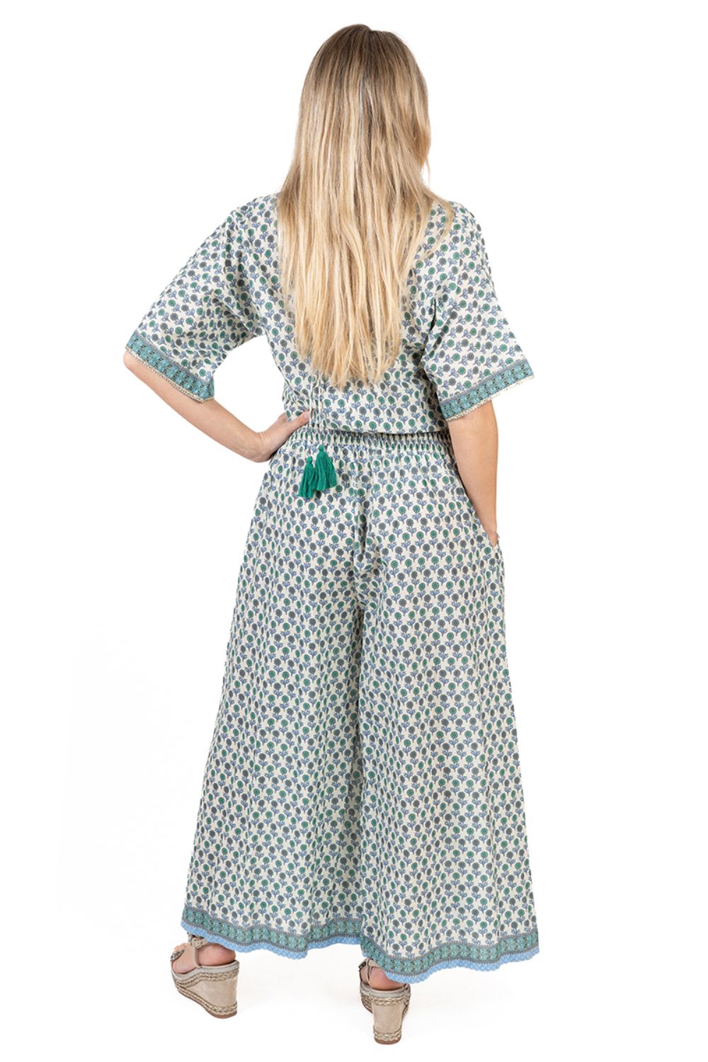 Jumpsuit Cổ V Kết Kim Loại Cotton Isla Bonita, chất liệu cotton cao cấp, mềm mại, nổi bật phần tay kết kim loại tinh tế. Có túi 2 bên. Ống quần xòe rộng. Bo thun