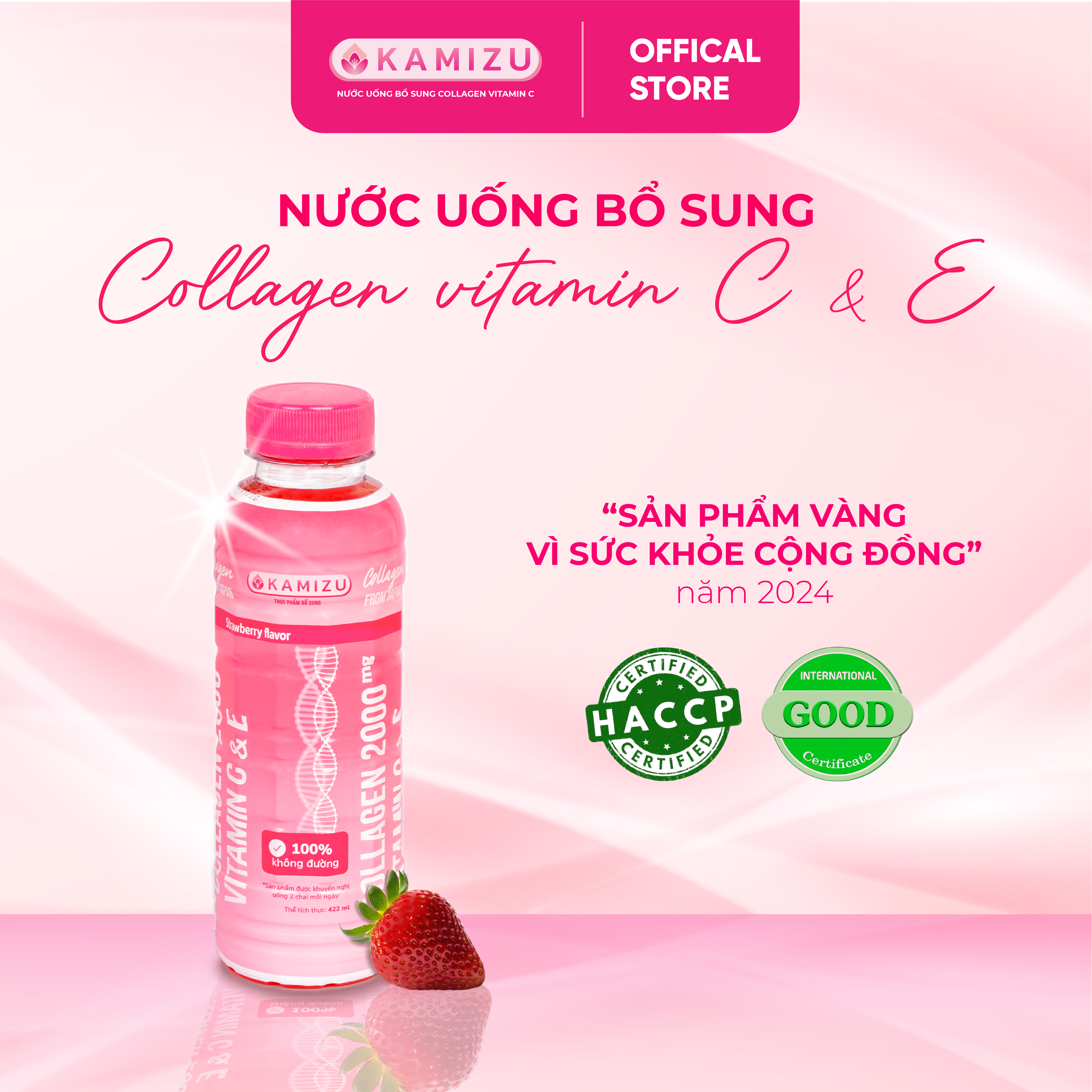 Nước uống bổ sung Kamizu Collagen Vitamin C & E Thành phần: Nước tinh khiết , Collagen fish, Vitamin C & E , hương liệu tổng hợp hương DÂU , chất tạo ngọt tổng hợp: Sucralose. Thời hạn sử dụng: 12 tháng kể từ ngày sản xuất Công dụng: . Nước uống bổ dung Kamizu hỗ trợ tăng cường, bổ sung collagen và vitamin C & E. . Vitamin C trong thức uống không chỉ có khả năng chống oxi hóa mạnh mẽ mà còn giúp tăng cường hấp thụ sắt và hệ miễn dịch, giúp cơ thể duy trì sức khỏe toàn diện. . Sản phẩm được bổ sung các thành phần giúp cho làn da tươi trẻ, căng tràn sức sống. . Với công thức độc đáo, Kamizu đã mang đến cho người tiêu dùng Việt một sản phẩm nước uống bổ sung cần thiết để da luôn khỏe mạnh từ bên trong.