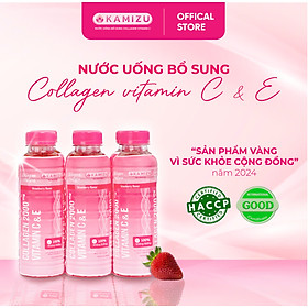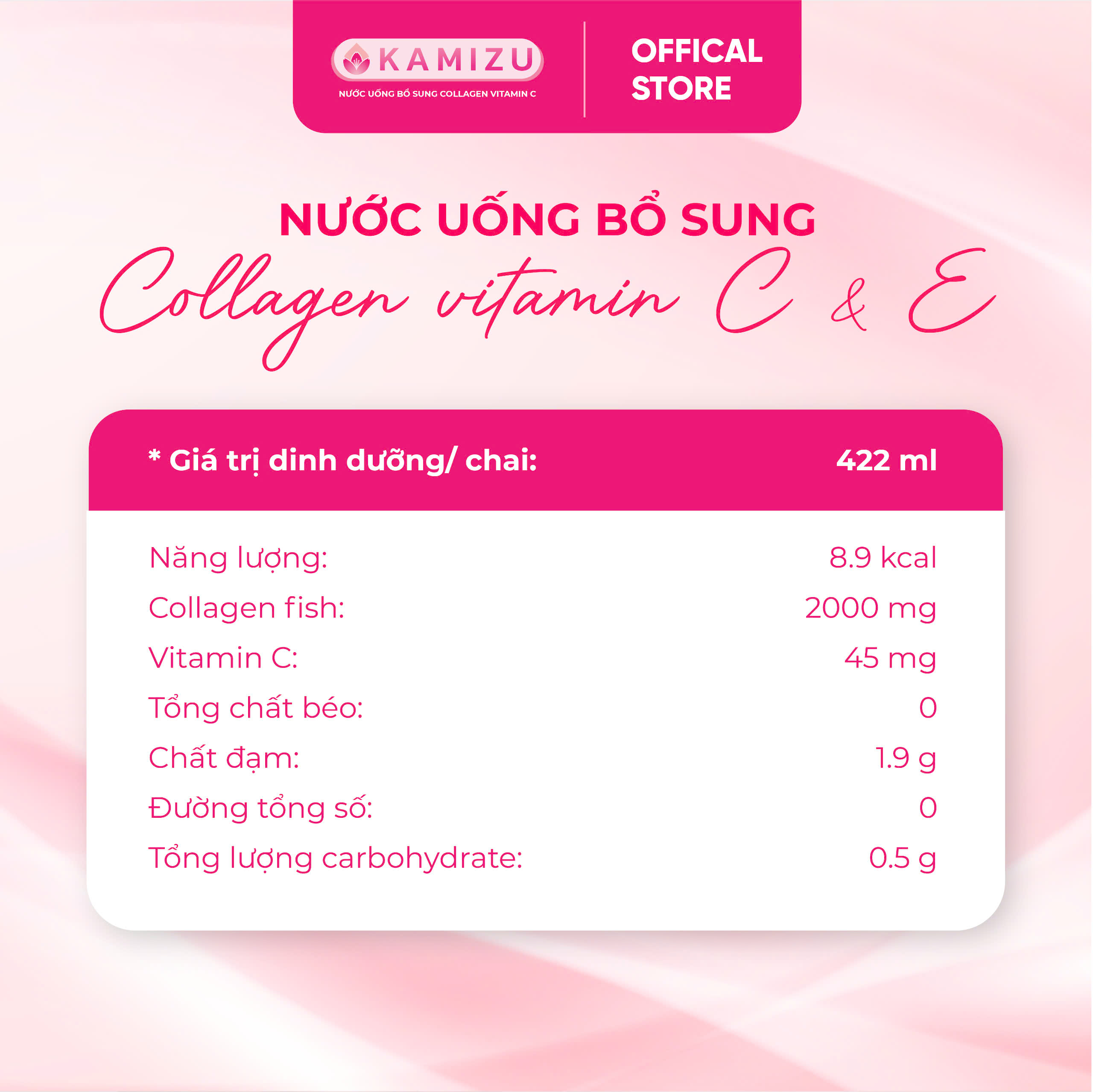 Nước uống bổ sung Kamizu Collagen Vitamin C & E - Thùng 24 chai Thành phần: Nước tinh khiết , Collagen fish , Vitamin C, hương liệu tổng hợp hương dâu , chất tạo ngọt