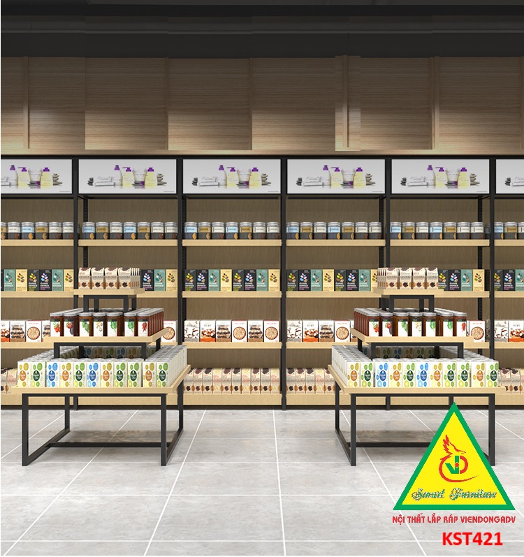 Kệ gỗ khung sắt trưng bày sản phẩm trong các cửa hàng trái cây, rau củ quả
