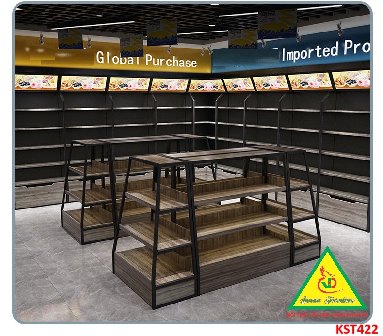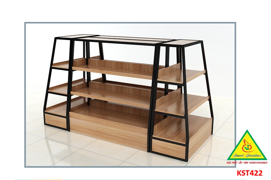 Kệ gỗ khung sắt trưng bày sản phẩm trong các cửa hàng trái cây, rau củ quả