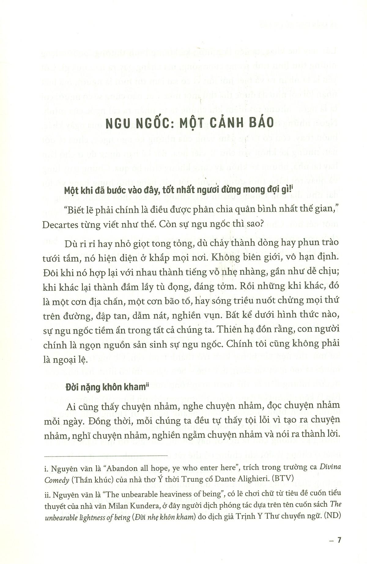 - Tại sao độc giả nên đọc cuốn sách này? Cuốn sách đem đến giá trị gì để giải quyết những lo lắng (đau đớn) của độc giả? (Hoặc tác giả đã giải quyết/đề xuất biện pháp gì để giải quyết nỗi đau trong cuốn sách?) Bao gồm các bài báo luận bàn về sự ngu si của các tác giả được biết đến là một trong những người thông minh nhất Đưa ra các nghiên cứu khoa học về người ngu, các thiên kiến xuất hiện trong nhưng người như vậy (thiên kiến đánh giá quá cao năng lực của bản thân, thiên kiến vị kỷ, thiên kiến miễn nhiễm, thiên kiến miễn tối…) Phân loại về chủng loại ngu dốt, các cấp độ của sự ngu si Kiến thức về học thuyết Con người kinh tế Sự khác nhau giữa hệ thống 1 và 2 trong tư duy Chức năng của não bộ liên quan đến sự ngu si