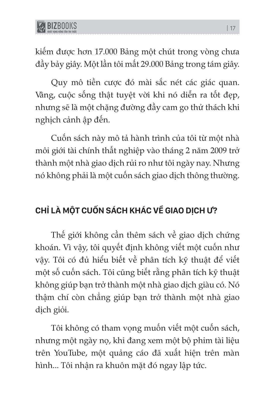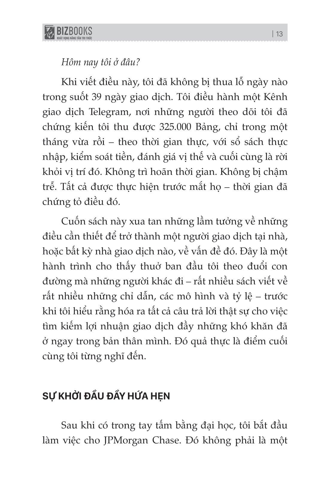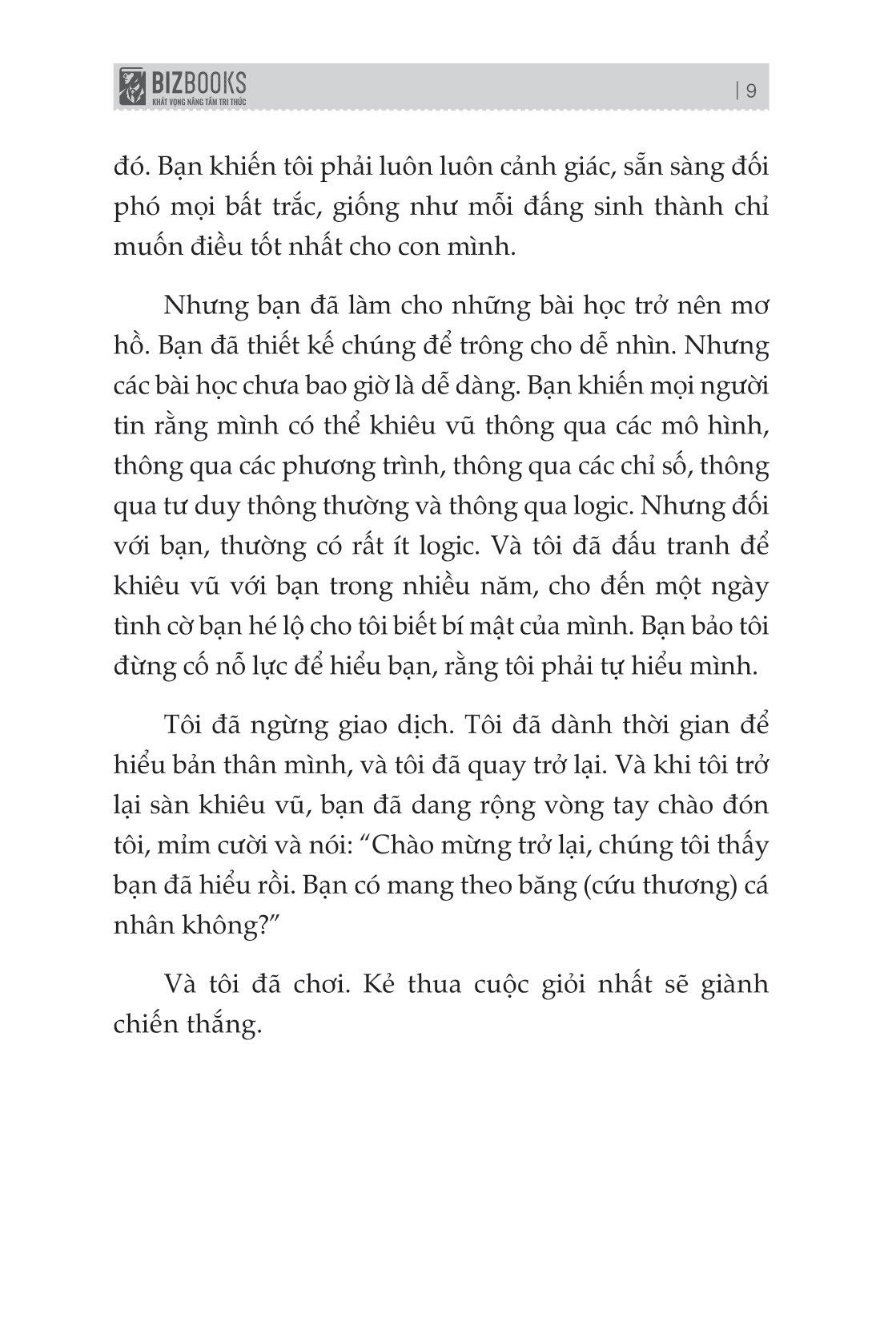 Cuốn sách mô tả cách chơi giao dịch, sự chuyển đổi để trở thành một nhà giao dịch nhất quán sẽ len lỏi vào cả các bình diện khác trong cuộc sống của bạn. Nó sẽ giúp bạn hiểu sâu về con người m.ình và những gì bạn có thể làm để cải thiện bản thân. Đích đến cuối cùng không chỉ là những con số tăng dần trên tài khoản giao dịch của bạn mà còn là một hành trình cuộc sống hài hoà, thú vị.