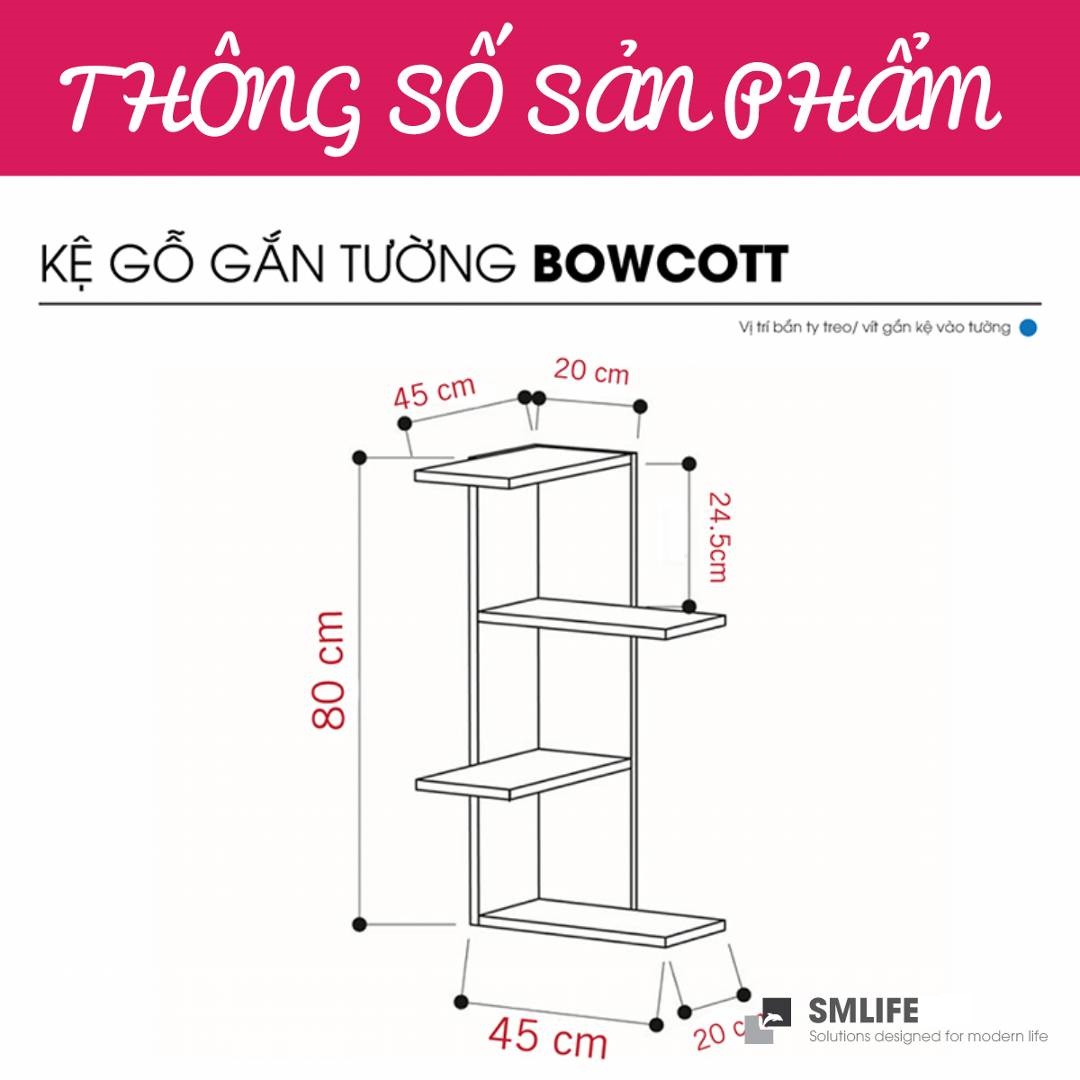 Mua tại TiktokMang đậm phong cách nội thất đơn giản, kệ gỗ trang trí gắn tường Bowcott là một sự bổ sung hoàn hảo cho căn hộ hay văn phòng của bạn. Kệ gỗ Bowcott được thiết kế theo phong cách đơn giản, hiện đại giúp bạn thoải mái trang trí sách hay các vật dụng trang trí an toàn. Sử dụng vật liệu ván ép công nghiệp MDF chống ẩm phủ Melamine cao cấp giúp kệ gỗ trang trí SMLIFE có độ bền cao, chống trầy và chống ẩm rất tốt. Bạn có thể tự lắp đặt sản phẩm dễ dàng với các phụ kiện và hướng dẫn đi kèm.