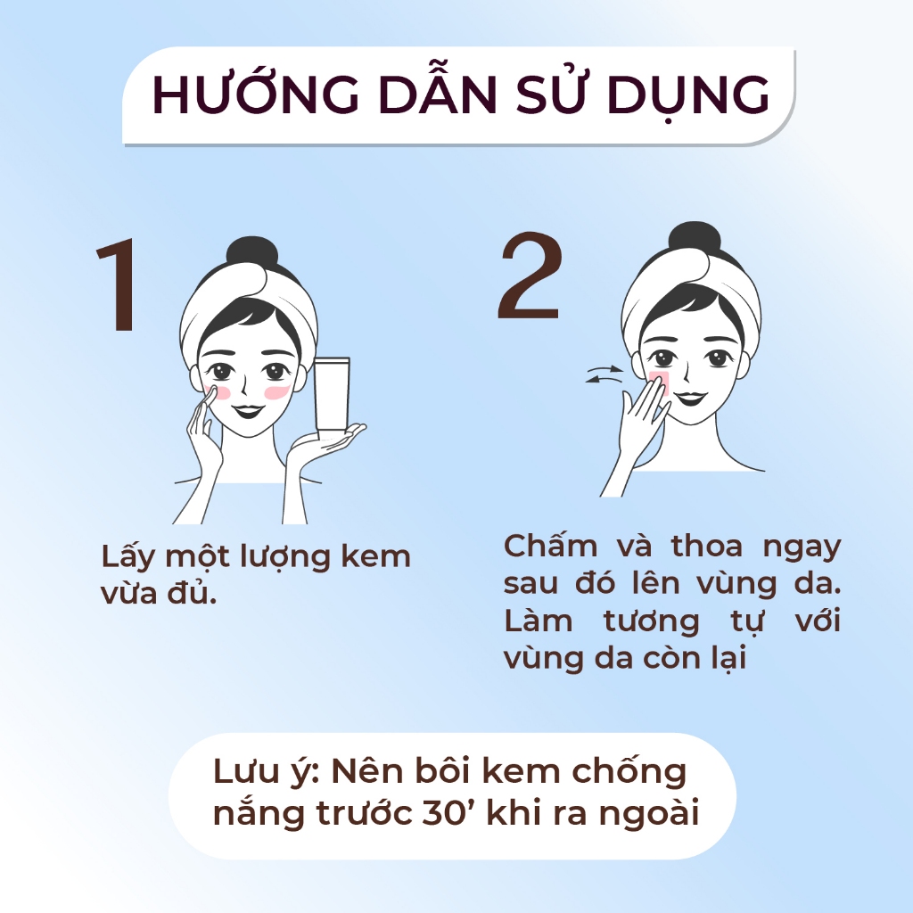 - Kem chống nắng hỗn hợp với 3 màng lọc tiên tiến: Kẽm Oxide: Ngăn chặn UVA, ngừa mụn, chống oxi hoá Octinoxate: Chống nắng phổ rộng hiệu quả Titanium Dioxide: Chống UVB, nâng tone nhẹ nhàng