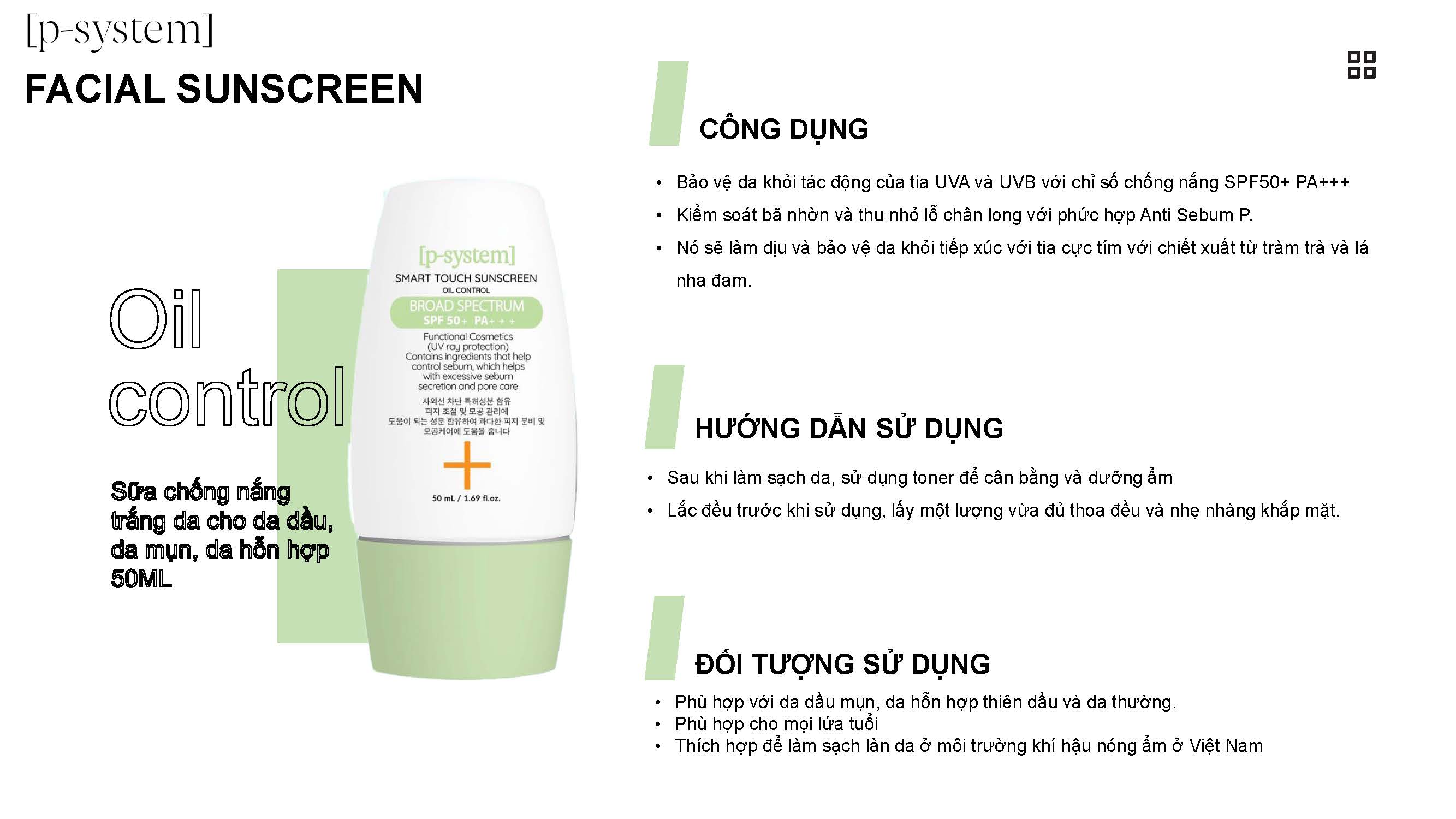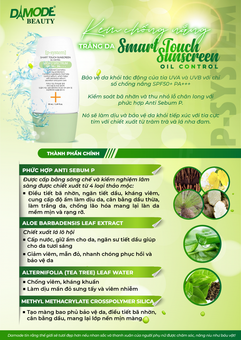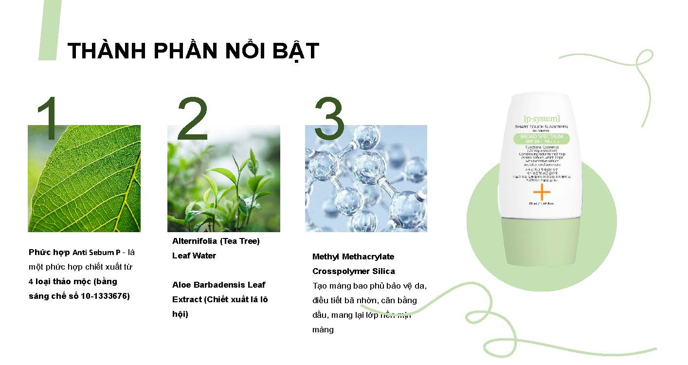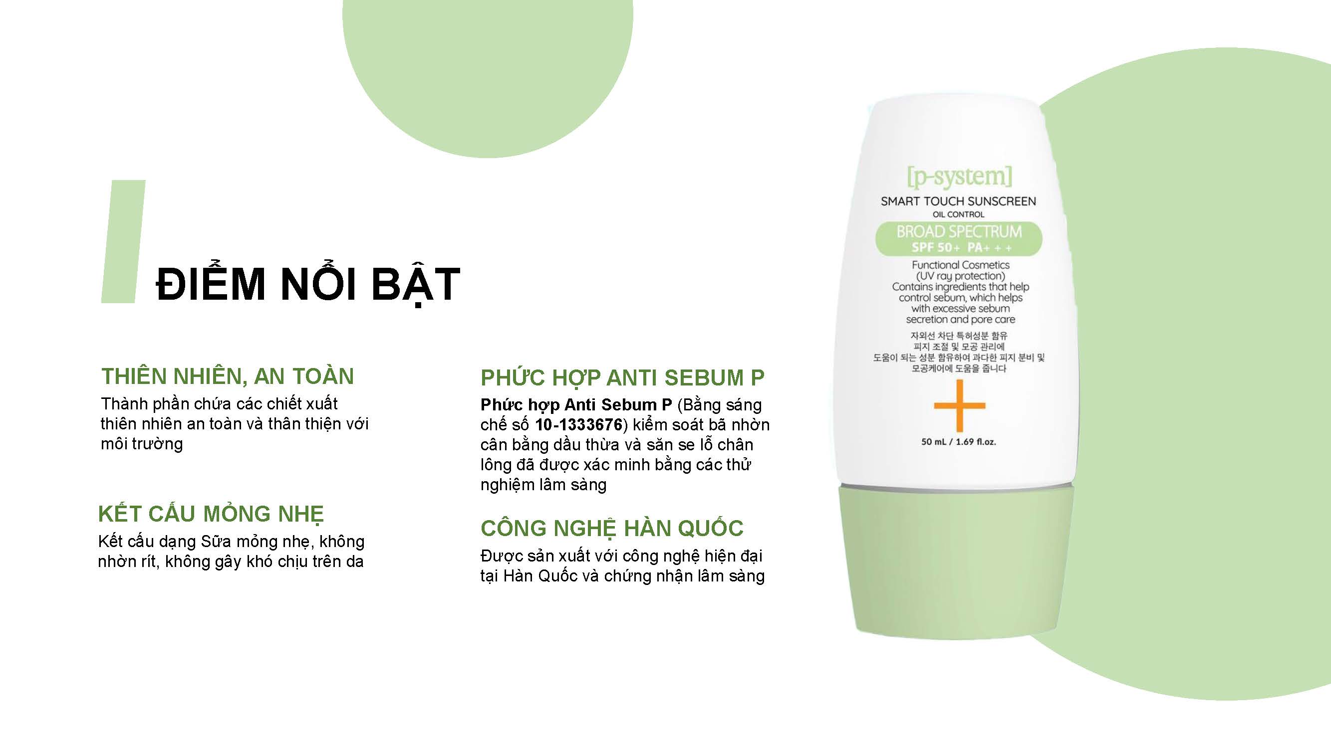 - Làm dịu da và kháng viêm, ngăn ngừa mụn Công dụng kem chống nắng cho da dầu mụn Smart Touch Sunscreen Oil Control P-system Thành phần Với công nghệ hiện đại Hàn Quốc được kiểm chứng lâm sàn, thành phần ưu việt từ thiên nhiên chứa phức hợp đạt bằng sáng chế khoa học Anti Sebum P. Phức hợp Anti Sebum P: Chiếc xuất từ 4 loại thảo mộc, Anh thảo đêm, sắn dây, rễ cây du Nhật Bản, thông lá dài. Có hiệu quả điều tiết bả nhờn. Làm dịu da chống lão hóa mang lại làn da mềm mịn và trắng sáng. Tea Tree Oil (Tinh dầu tràm trà): Chống viêm khoáng khuẩn làm dịu mẫn đỏ xưng tấy. Ngăn ngừa mụn tái phát. Chiếc xuất lô hội Cấp nước và giữ ẩm cho da, ngăn sự tiết dầu giúp cho da mềm mịn, dịu nhẹ GIảm viêm, mẫn đỏ, nhanh chóng phục hồi bảo vệ da. Chứng nhận kem chống nắng P-system Giấy chứng nhận đảm bảo thành phần công bố được kiểm duyệt, bao gồm các đơn vị xuất nhập khẩu và nhà sản xuất. Giấy chứng nhận kem chống nắng Smart Touch Sunscreen Oil Control