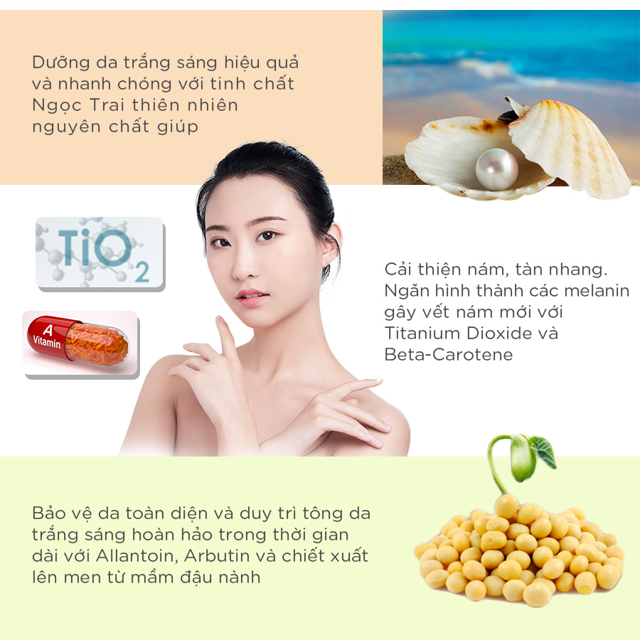 • Dưỡng da và làm da trắng sáng hiệu quả, nhanh chóng nhờ bột ngọc trai giúp nuôi dưỡng các tế bào da từ sâu bên trong.