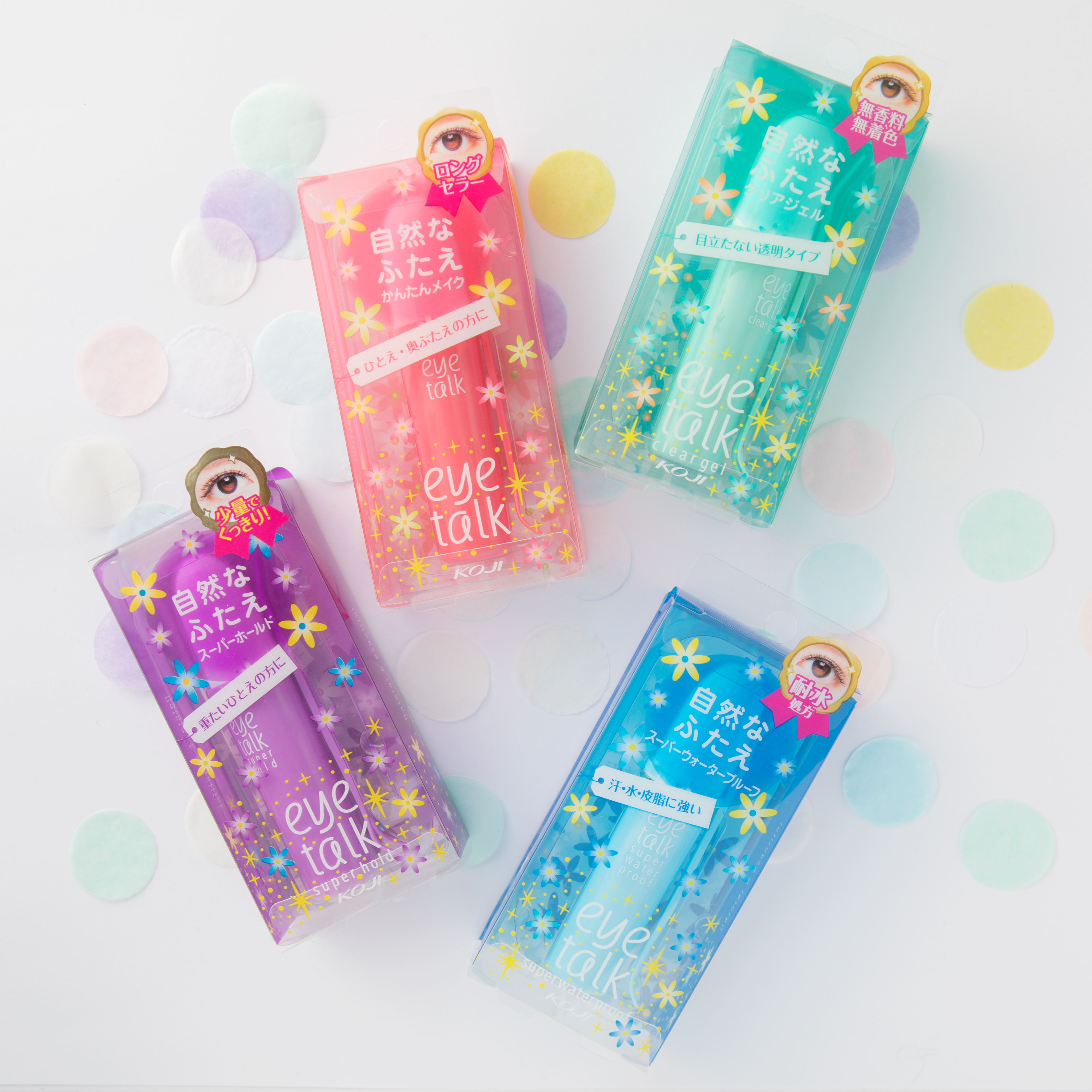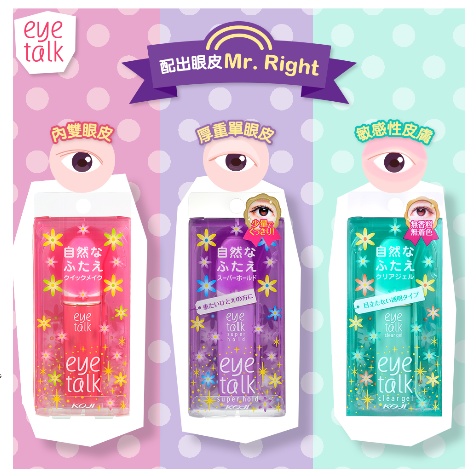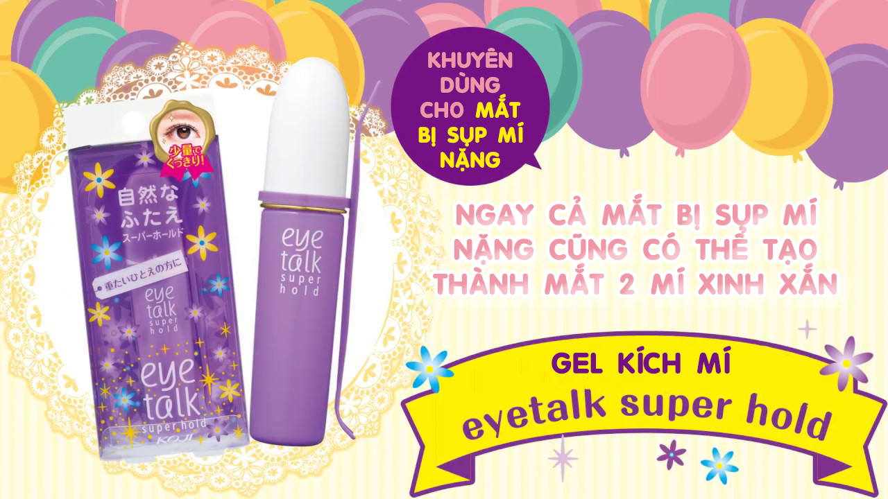 - Eye Talk Super Hold (6ml): thiết kế màu tím, là phiên bản giới hạn, phù hợp cho các bạn bị sụp mí nặng, có chức năng bám dính vượt trội lưu giữ trên da một thời gian dài cho bạn thoải mái vận động, hãy cứ tự tin tỏa sáng với dán kích mí Koji, chứa hyaluronic acid (cấp ẩm, chống lão hóa), thực vật ceramide (lớp lipid bảo vệ da, chiết xuất quả Yuzu, trong quả Yuzu chứa nhiều vitamin C chống oxy hóa hiệu quả), không mùi không màu, không latex.