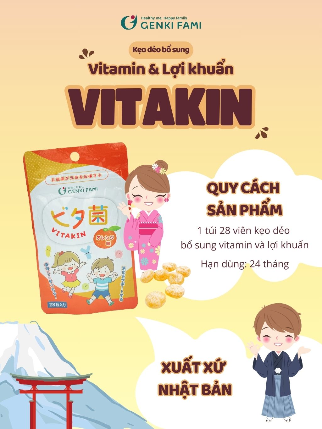 THÀNH PHẦN: Đường cát, siro tinh bột, bột màng oblate, nước cam cô đặc, lợi khuẩn axit lactic ( 1 tỷ lợi khuẩn), dầu gan cá mập tinh chế (11.33 mg), vitamin C (