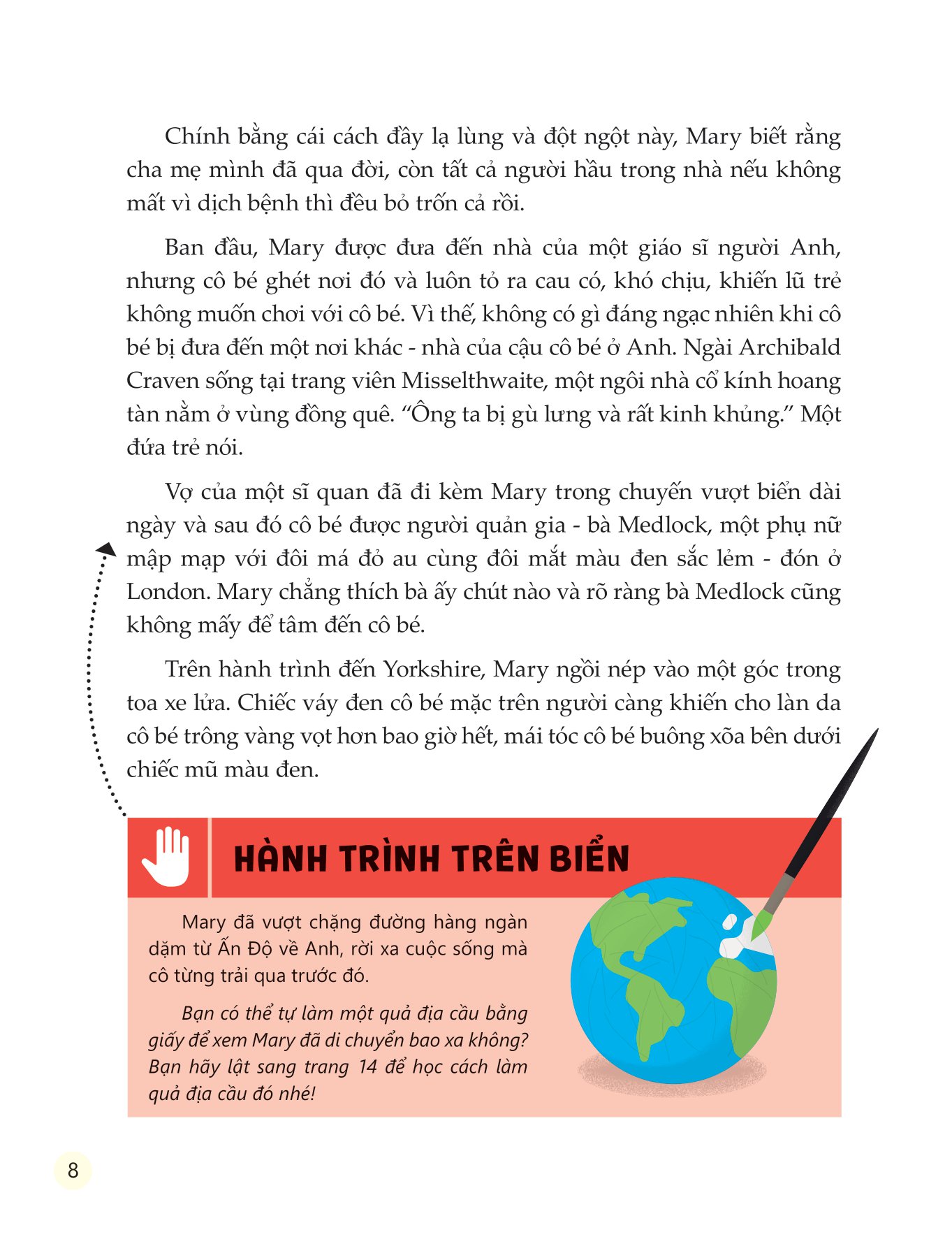 Mọi người đều nói Mary Lennox có vẻ ngoài chẳng ai ưa nổi, cái mặt gầy choắt còn biểu cảm thì cau có, khó gần. Mary sinh ra ở Ấn Độ. Cha của cô bé làm việc cho chính phủ Anh, còn mẹ cô bé là một phụ nữ vô cùng xinh đẹp, có điều dường như họ chẳng hề bận tâm đến việc nuôi dạy đứa con gái nhỏ của mình. Lúc nào Mary cũng ở cùng bảo mẫu và bị tách xa khỏi cha mẹ hết mức có thể. Mẹ của Mary không thích nghe thấy tiếng khóc của con gái mình, cho nên những người hầu trong nhà luôn cố gắng chiều theo mọi yêu cầu của cô bé. Bởi thế mà chẳng có gì đáng ngạc nhiên khi lớn lên, cô bé lại trở thành một đứa trẻ ích kỷ.