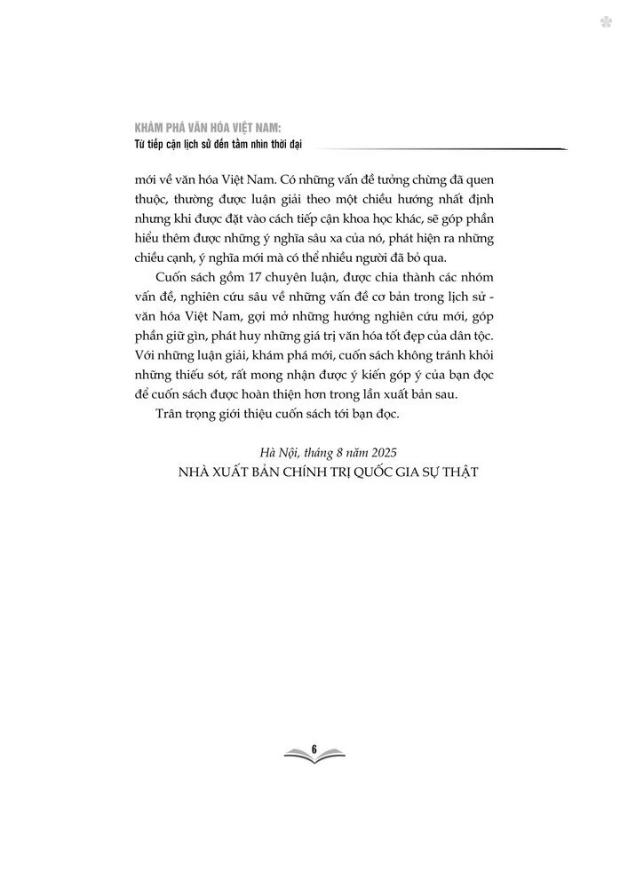 Mua tại TiktokCuốn sách “Khám phá văn hóa Việt Nam: Từ tiếp cận lịch sử đến tầm nhìn thời đại” gồm 17 chuyên luận, được chia thành các nhóm vấn đề cơ bản trong lịch sử văn hóa Việt Nam, gợi mở những hướng nghiên cứu mới, góp phần giữ gìn, phát huy những giá trị văn hóa tốt đẹp của dân tộc. Trân trọng giới thiệu cuốn sách tới bạn đọc!