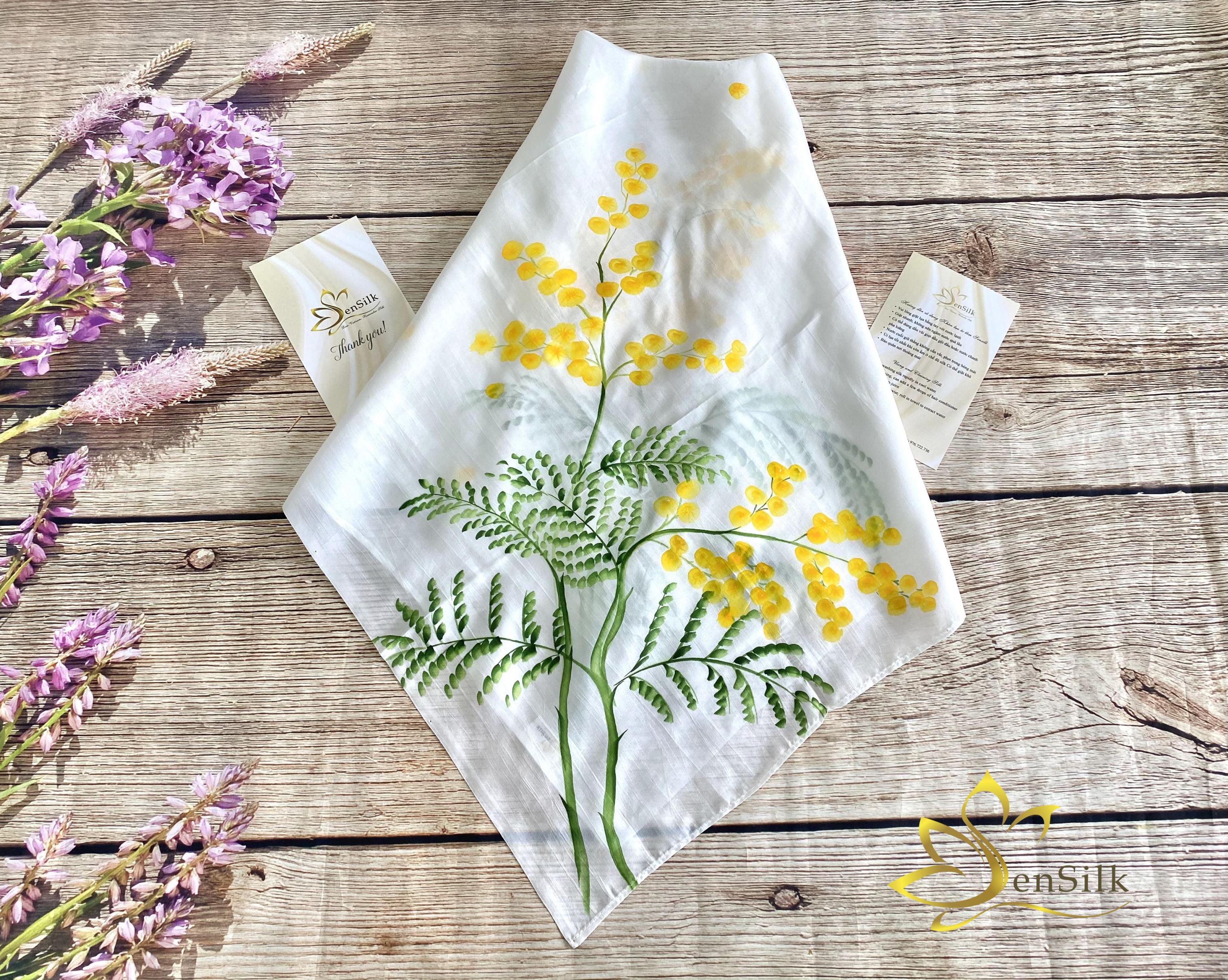 Khăn Lụa Handmade Vẽ Hoa Mimosa SenSilk – tượng trưng cho những tình cảm chân thành, thầm kín và sự cảm thông sâu sắc… Hoa Mimosa được yêu thích không chỉ bởi dáng cây đẹp, cành lá lấp lánh ánh bạc, chùm hoa vàng rực rỡ kiêu sa đầy quyến rũ mà chúng còn được yêu thích bởi chính ý nghĩa của chúng.