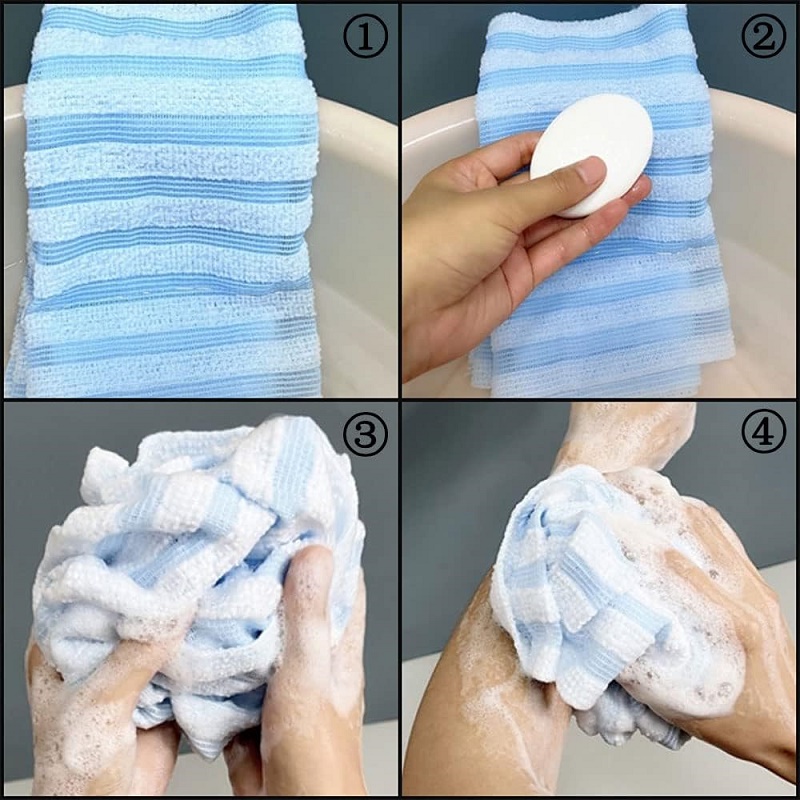 Khăn tắm Akasuri giúp lấy sạch tế bào chết, vảy sừng trên lưng mà không gây trầy xước da, giúp da ở vùng lưng luôn mịn màng, mềm mại. Khăn còn có tác dụng massage