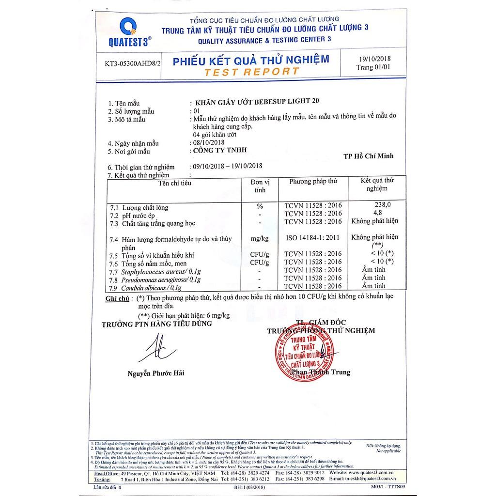 - Trung thực và minh bạch khi sử dụng các thành phần theo đạo luật mỹ phẩm. Tuyệt đối không dùng đến các thành phần có hại cho da gồm 15 chất như chất bảo quản paraben, CMIT, MITĐược viện kiểm tra và nghiên cứu KTV Hàn Quốc chứng nhận không có các chất độc hại trong sản phẩm khăn ướt của BEBESUP. Kích thước: 200x180 (+-5mm) Khăn ướt BEBESUP SENSITIVE 80 tờSố lượng khăn trong 1 gói: 80 tờ - 380g
