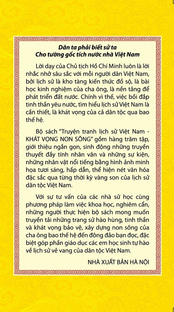 Bộ sách “Truyện tranh lịch sử Việt Nam – Khát vọng non sông” gồm hàng trăm tập, giới thiệu ngắn gọn, sinh động những truyền thuyết đầy tính nhân văn và những sự kiện, những nhân vật nổi tiếng trong lịch sử hàng nghìn năm của dân tộc Việt Nam. Đại chiến Bạch Đằng Giang 1288, quân Nguyên rơi vào thế trận mai phục của quân ta – Bằng mưu lược và sự tính toán tài tình, Hưng Đạo Vương Trần Quốc Tuấn vận dụng lợi thế của tự nhiên bày ra thế trận trên sông Bạch Đằng. Trận chiến thể hiện nghệ thuật quân sự tuyệt vời của ông cha ta trong việc giữ nước trước kẻ thù mạnh và là bài học học lớn trong việc dụng binh và chiến tranh toàn dân của dân tộc.