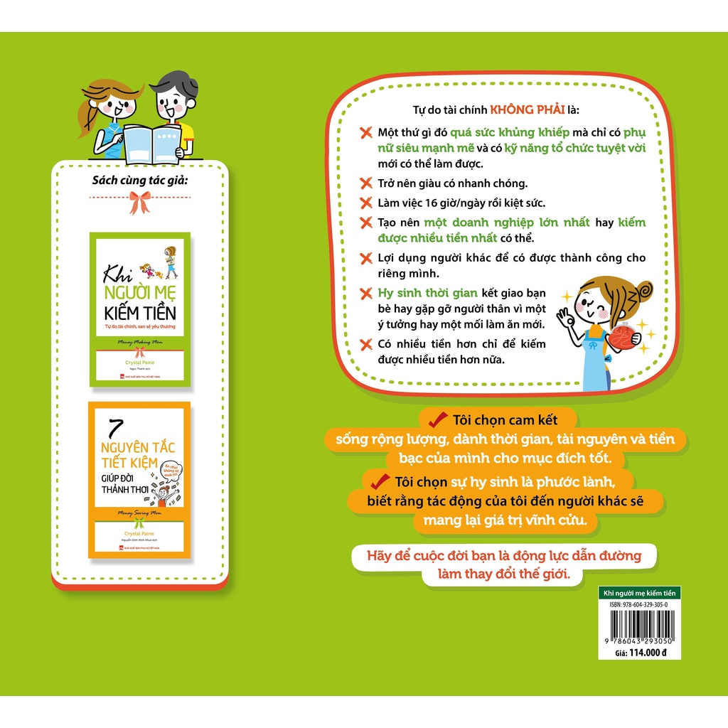 Là một người nội trợ, tác giả Crystal Paine thấu hiểu được niềm hạnh phúc của những người phụ nữ mong muốn ở nhà để được chăm sóc, gần gũi con nhỏ, nhưng đồng thời cũng muốn kiếm thêm nguồn thu nhập đỡ đần gia đình. Vì thế, “Khi người mẹ kiếm tiền: Tự do tài chính, san sẻ yêu thương” ra đời. Cuốn sách khuyến khích người đọc đào sâu hết mức có thể để khám phá tài năng, kỹ năng, đam mê và kiến thức của bản thân, từ đó kết hợp tất cả lại thành một công việc/dự án kinh doanh riêng để kiếm tiền. Đồng thời, cuốn sách còn hướng dẫn chi tiết từ cách phát triển bản thân, xây dựng thương hiệu, mục tiêu của doanh nghiệp, thuê nhân viên cho đến quản lý thời gian và vượt qua những chướng ngại sẽ gặp phải trên hành trình tiến tới tự do tài chính – vấn đề cốt lõi của cuốn sách.