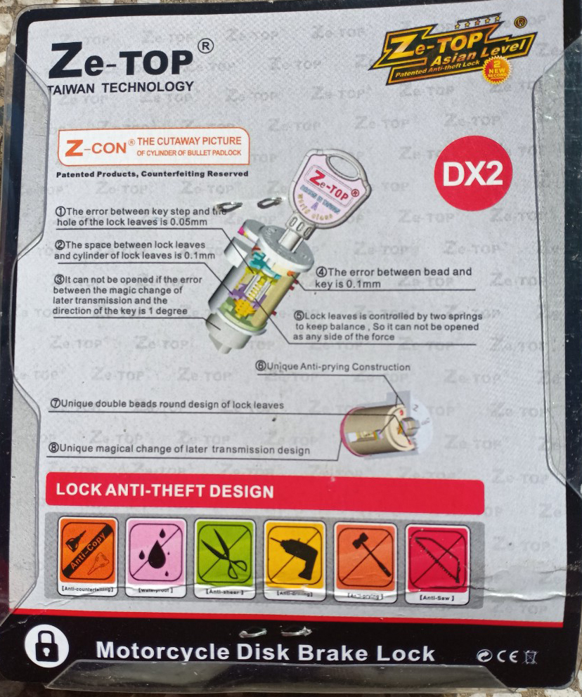 Sản phẩm bao gồm: 01 khóa đĩa Z-CON, 02 chìa khóa đặc biệt chống chìa Vạn Năng. Kết cấu bên trong ổ khóa theo công nghệ Đài Loan, không sử dụng ruột bi. Chìa khóa được thiết kế theo mẫu mã đặc biệt, chống lại được cả chìa Vạn Năng và các thủ thuật bẻ khóa.