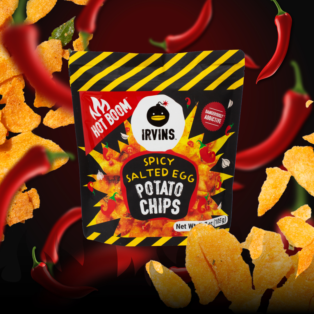 Irvins ra mắt size mới!! Khoai tây trứng muối cay 50g Bạn đã sẵn sàng cho một thử thách bùng nổ? Hot Boom là hương vị hoàn hảo từ IRVINS dành cho những tín