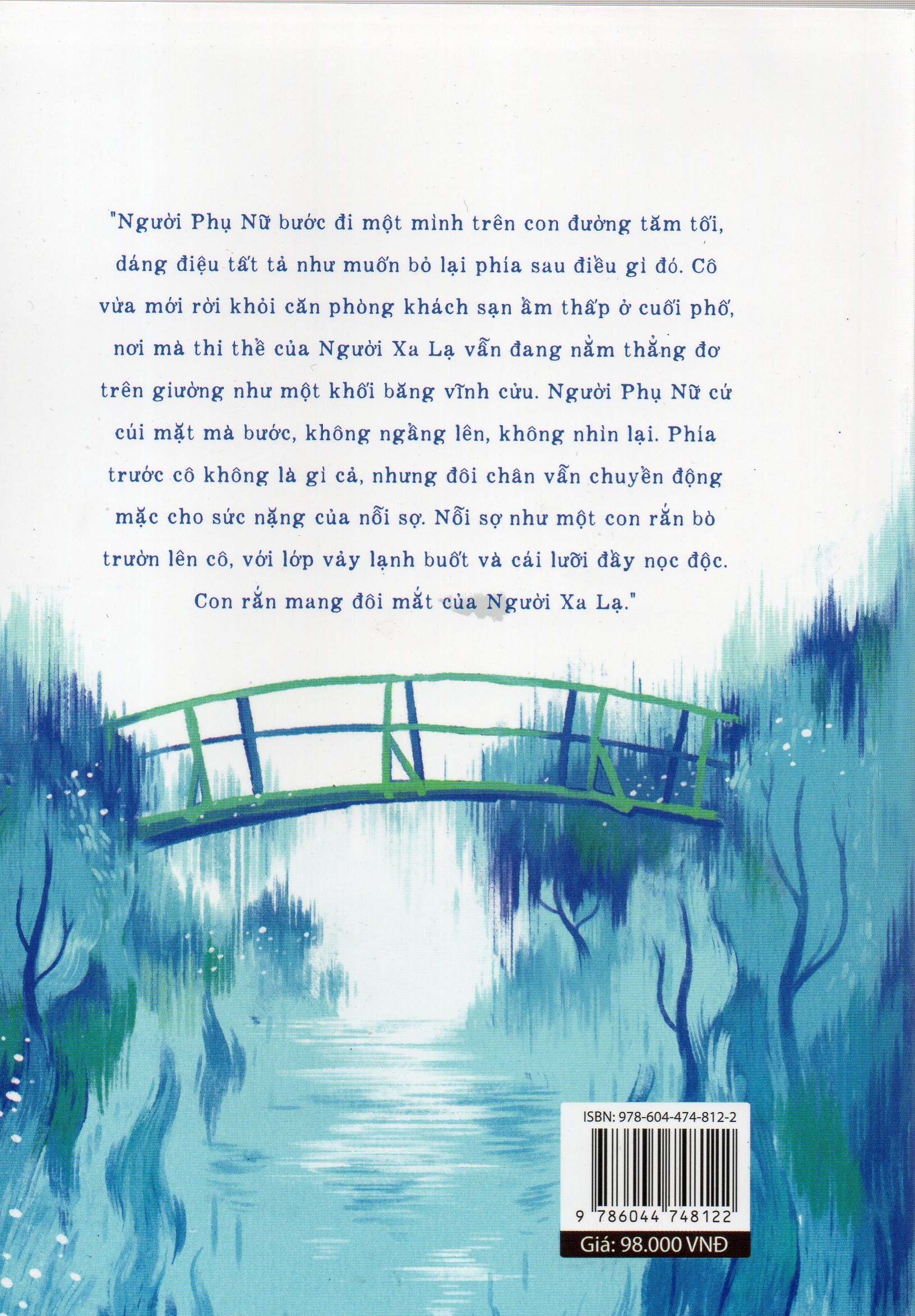 Mua tại Tiktok" Người Phụ Nữ bước đi một mình trên con đường tăm tối, dáng điệu tất tả như muốn bỏ lại phía sau điều gì đó. Cô vừa mới rời khỏi căn phòng khách sạn ẩm thấp ở cuối phố , nơi mà thi thể của Người Xa Lạ vẫn đang nằm thẳng đơ trên giường như một khối băng vĩnh cửu. Người Phụ Nữ cứ cúi mặt àm bước, không ngẩng lên, không nhìn lại. Phía trước cô không là gì cả, nhưng đôi chân vẫn chuyển động mặc cho sức nặng của nỗi sợ. Nỗi sợ như một con rắn bò trườn lên cô, với lớp vảy lạnh buốt và cái lưỡi đầy nọc độc. Con rắn mang đôi mắt của Người Xa Lạ"