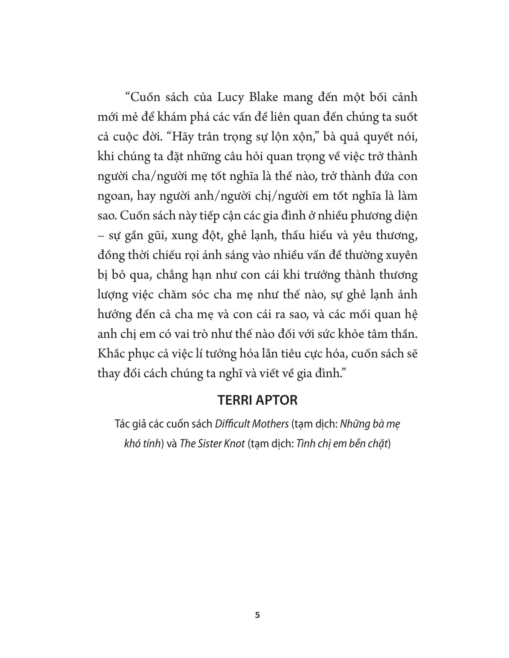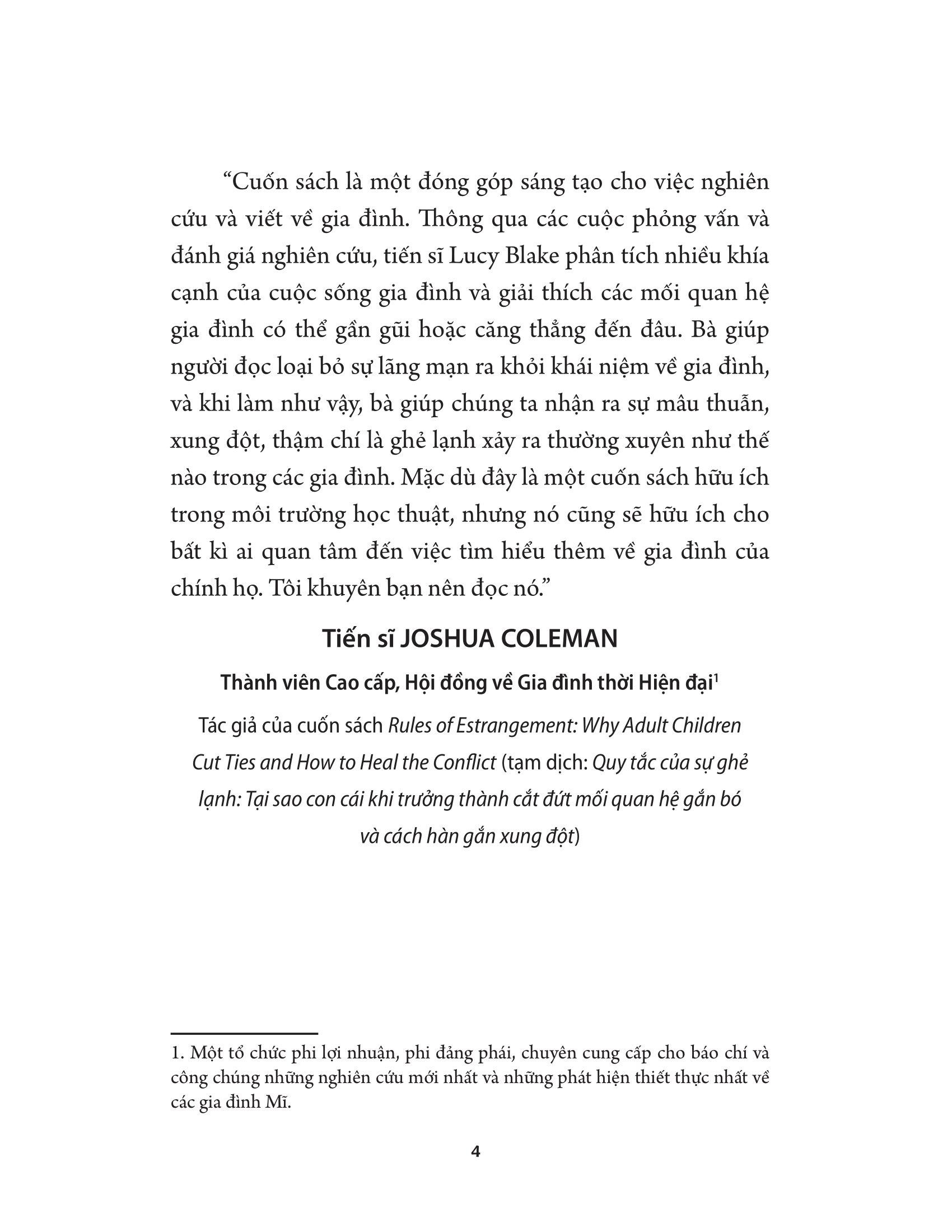 Cuốn sách Không Gia Đình Nào Hoàn Hảo sẽ giúp bạn loại bỏ cảm giác lo âu, sự hoài nghi. Khắc phục cả việc lí tưởng hóa lẫn tiêu cực hóa, cuốn sách sẽ thay đổi cách chúng ta nghĩ và viết về gia đình. Đây là cuốn sách hữu ích cho bất kì ai quan tâm đến việc tìm hiểu thêm về gia đình của chính họ.