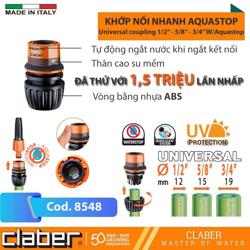Claber là thương hiệu được thành lập năm 1969 tại Italy và là thương hiệu thiết bị tưới hàng đầu thế giới. Hiện tại, Claber đã có mặt tại hơn 90 quốc gia và nằm trong top 3 bình chọn của người dùng trên Amazon và Ebay.