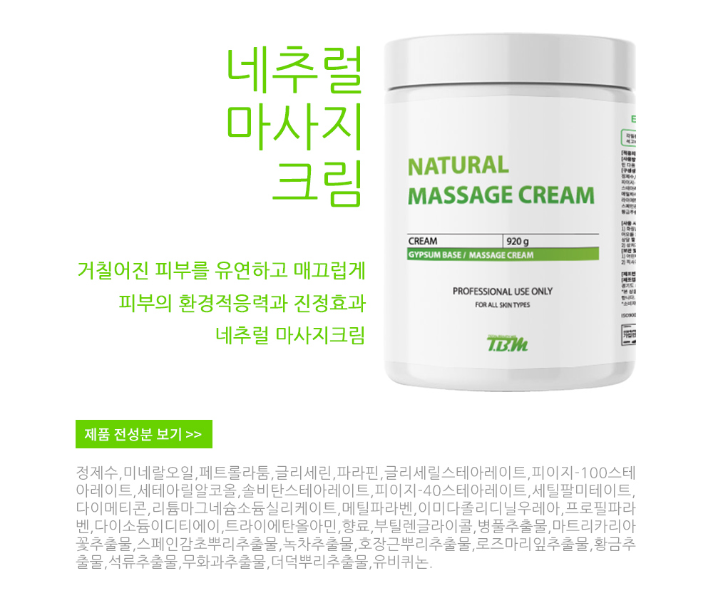 Kem Massage thiên nhiên NATURAL MASSAGE CREAM TBM là dòng kem massage chuyên dùng cho mặt và cơ thể giúp dưỡng ẩm và mang lại cảm giác mềm mịn khi đang massage. - Với liệu