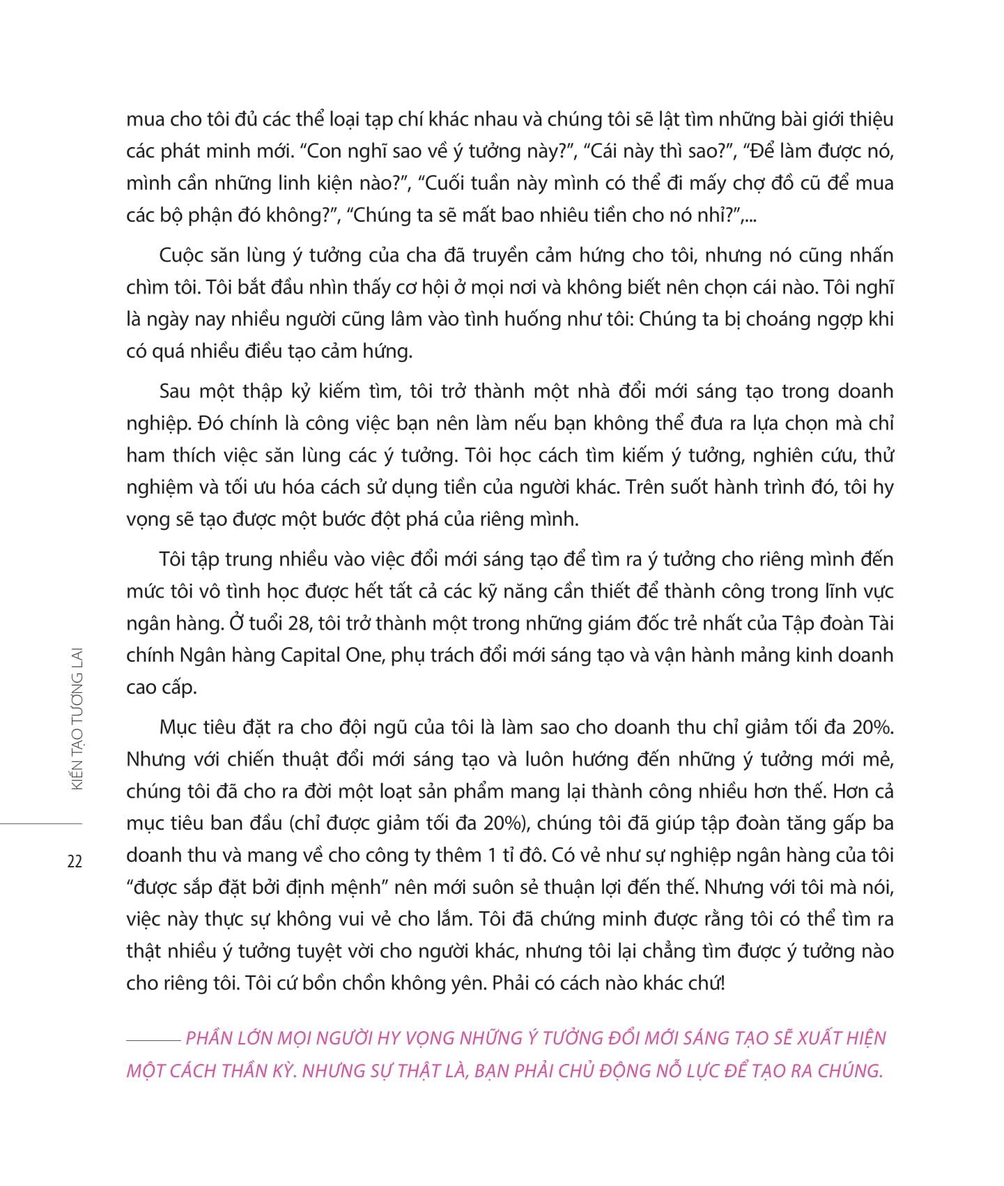 Tuy nhiên, vấn đề là khả năng thay đổi của bạn sẽ bị hạn chế bởi 7 cái bẫy tư duy. Những cái bẫy này sẽ làm tiềm năng đổi mới sáng tạo của bạn giảm đến 93%. Chưa kể, chúng còn che mắt bạn, khiến bạn không thể thấy được cơ hội đổi mới sáng tạo, và thế là bạn tiếp tục bám chặt vào những lối mòn quen thuộc. Đó là lý do vì sao hầu hết mọi người đều không phát huy được tối đa tiềm năng của họ. Vì vậy, quyển sách “Kiến Tạo Tương Lai - Chiến thuật tư duy đột phá” sẽ mang đến cho bạn những giải pháp để giải quyết vấn đề này.