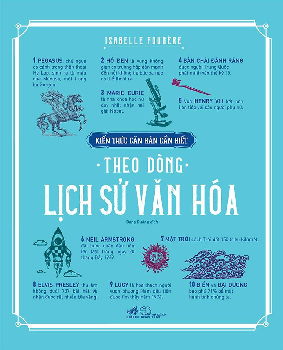 - Bạn có biết mười giai đoạn then chốt trong quá trình phát triển của loài người, của y học và lịch sử khoa học? Theo dòng lịch sử văn hóa sẽ giúp bạn khám phá hoặc khám phá lại tất cả các khái niệm quan trọng nhất về văn hóa: những thần thoại quan trọng, những trào lưu văn học lớn nhất, những hệ thống triết học chủ đạo và những người sáng lập, những khám phá cơ bản, những kỷ lục khó tin nhất, những nghệ sĩ tiêu biểu nhất, những khái niệm then chốt của khoa họ Nhờ bức tranh toàn cảnh tổng hợp về những sự kiện lớn, những phát minh làm thay đổi thế giới, những nhân vật nổi bật, bạn sẽ biết mọi thứ về nghệ thuật và văn học, điện ảnh và thể thao, lịch sử và địa lý qua từng thế kỷ. TÁC GIẢ: Isabelle Fougère là nhà báo và nhà văn tự do người Pháp đã cộng tác với nhiều tờ báo, tạp chí, và kênh truyền hình lớn như Arte, TV5 Monde, France Culture hay Le Figaro Magazine. Cô là tác giả của nhiều cuốn sách phi hư cấu, tiểu luận và sách cho trẻ em, trong đó có Lại là các câu hỏi vì sao và Vì sao? thuộc xê ri “Hỏi đáp cùng em”. Cô đồng sáng lập và tổ chức giải Canon dành cho nữ phóng viên ảnh tại lễ hội Visa pour l'image, do Hiệp hội các nhà báo nữ trao tặng và Tạp chí Figaro hỗ trợ. Ngoài ra, cô còn dành nhiều năm hoạt động vì nhân quyền và phụ nữ. "