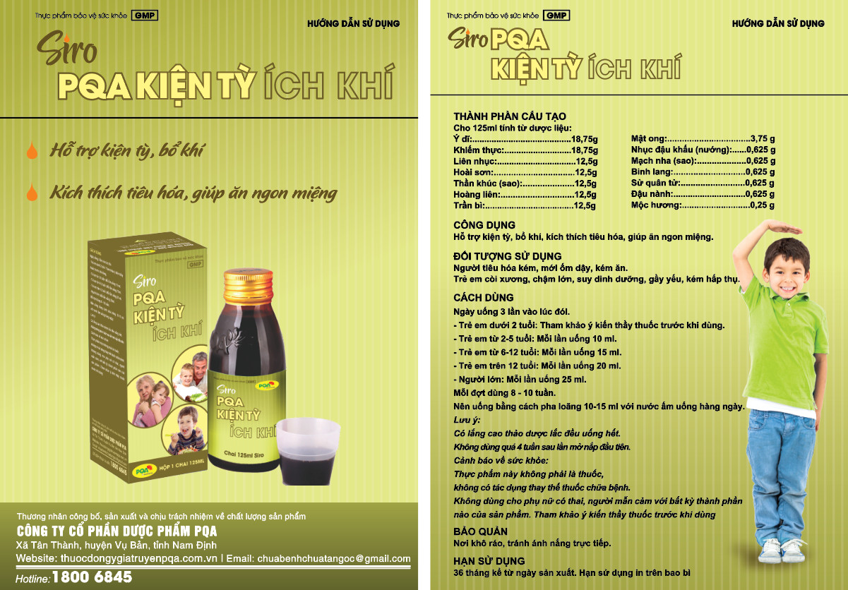 - Địa chỉ sản xuất: Công ty Cổ phần Dược phẩm PQA. Thửa 99, Khu Đồng Quàn, Xã Tân Thành, Huyện Vụ Bản, Tỉnh Nam Định. THÀNH PHẦN: