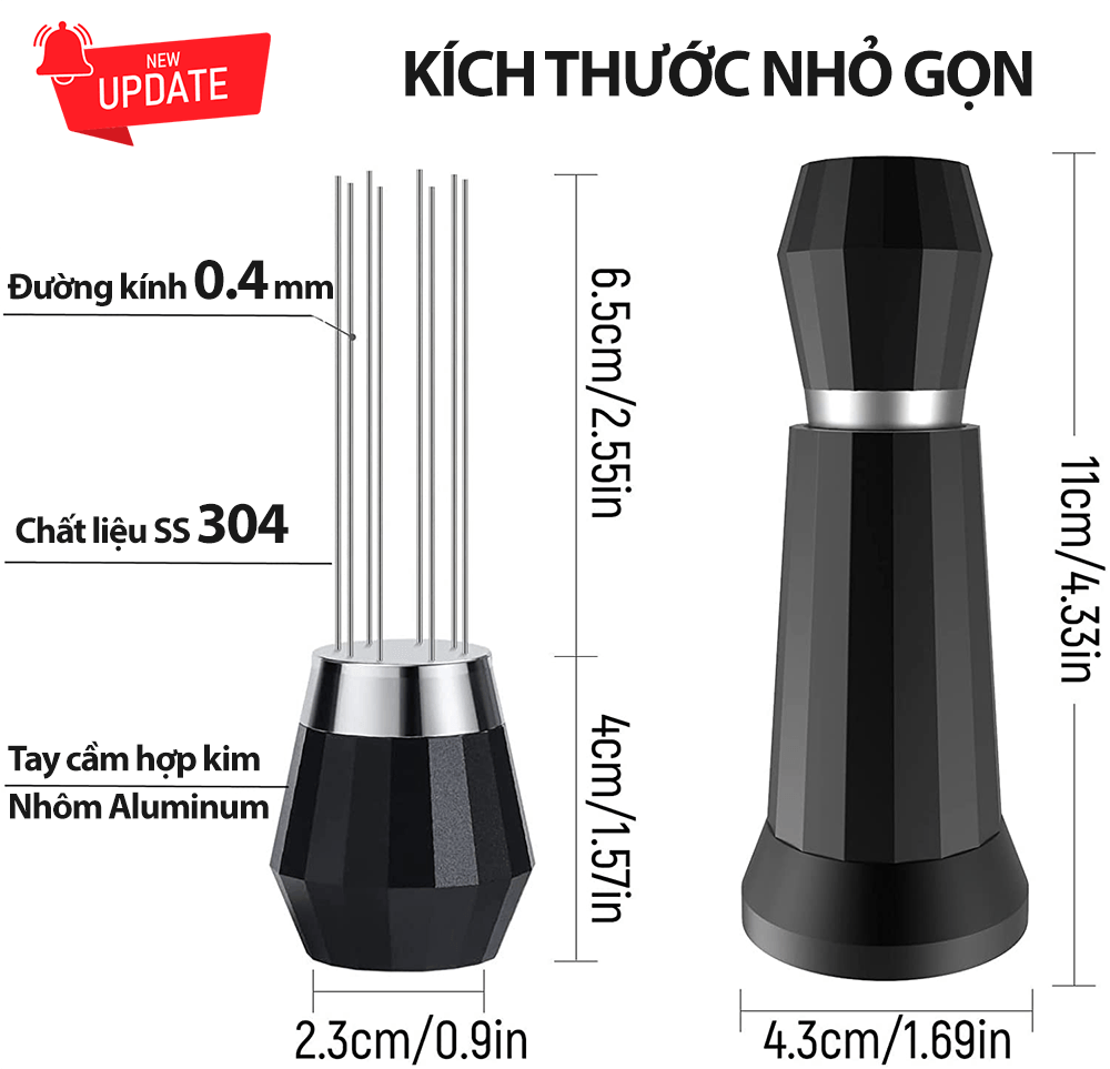 Kim đánh tơi bột cà phê WDT Một dụng cụ giúp ích cho việc pha chế các Espresso tuyệt vời, đạt chuẩn chất lượng nhanh chóng. Chống channeling Khi pha chế bằng máy pha cà phê Espresso, thông thường cà phê khi xay ra mịn sẽ làm vón cục, dẫn tới quá trình nén và chiết xuất họng pha sẽ không đồng đều, không đủ áp, xuất hiện hiện tượng channeling khi pha. Kim đánh tơi bột cà phê WDT sẽ rất hữu ích giúp cho việc phân bổ đồng đều cà phê bột bên trong, chống bị bón cục. Với thiết kế tám khi khuấy, là phiên bản nâng cấp của các WDT trước đây, giúp người dùng đánh tơi dễ hơn, và giảm thiểu thời gian đơn giản hơn. Sở hữu đường kính kim chỉ còn 0.4mm với chất liệu SS304 bền bỉ. Phiên bản cũ đã bị đánh bại hoàn toàn với đường kính này. Thiết kế có thể tháo rời toàn bộ các bộ phận riêng biệt. Vệ sinh Kim đánh tơi bột cà phê WDT dễ dàng mà đơn giản. Đặc biệt là phần Đế, giúp việc làm sạch bột cà phê lâu ngày quá tiện lợi