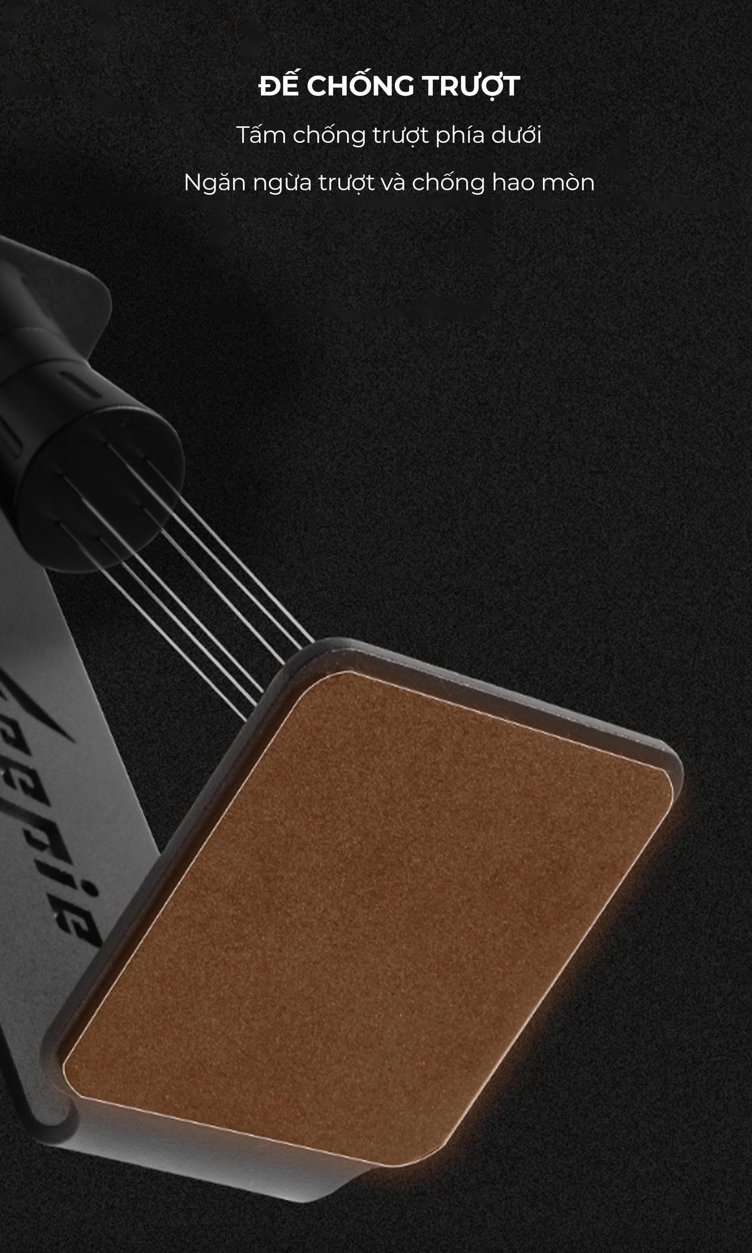 Sản phẩm được thiết kế dạng núm vặn bằng hợp kim nhôm sơn nhám. Cảm giác cầm rất chắc chắn và vừa tay. 8 thanh kim loại mỏng có độ dẻo và có thể uốn cong len lõi đánh tơi đến mọi nơi bên trong bánh cà phê. Khi bột được đánh tơi sẽ giúp phần tamping tốt hơn rất nhiều, áp suất nước sẽ chiết xuất đều hơn.