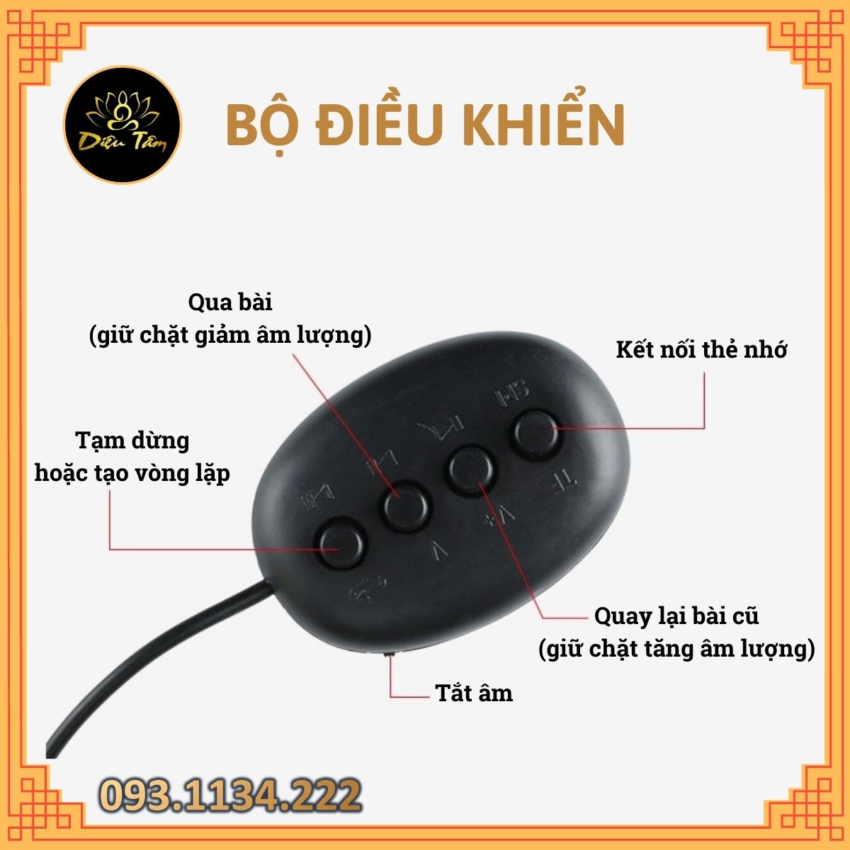 - Cao 20cm, rộng 10cm Kinh luân điện có sẵn 41 bài hát->có thể tắt mở tuỳ ý Kinh luân là gì?Kinh luân là một bộ phận không thể tách rời khỏi văn hóa và thực hành tâm linh Phật giáo Tây Tạng. Mục đích ban đầu của thực hành kinh luâncủa truyền thống Phật giáo Tây Tạng là xoa dịu mọi chúng sanh đang đau khổ. Ý nghĩa: Sự thực hành Kinh luân có rất nhiều lợi ích kỳ diệu. Tương truyền, kinh luân được mang đến từ thế giới của loài Rồng (là những chúng sanh sống trong các đại dương) nhờ bồ tát Long thọ vì ngài được mách bảo bởi bồ tát Quan-Âm trong một linh kiến rằng “những lợi ích của nó đối với chúng sanh là vô cùng to lớn”. Ngài Long thọ đã trao cho vị Dakini mặt sư tử phương pháp thực hành kinh luân, về sau vị này dạy lại cho Đức Liên-Hoa-Sanh, người đã truyền nó vào Tây tạng. Đức Phật Thích-Ca Mâu-Ni dạy rằng một lần quay kinh luân còn tốt hơn là nhập thất trong nhiều năm, dù đó là một thực hành tâm linh mãnh liệt. Ngài bảo “Chuyển bánh xe pháp còn tốt hơn lắng nghe, suy tư và thiền định trong một tỷ năm” Đức Phật A-Di-Đà dạy “Kẻ nào trì tụng thần chú Sáu âm trong lúc quay kinh luân phước của kẻ đó ngang với 1000 vị Phật”. Đức Liên-Hoa-Sanh bảo “ngay cả với kẻ thiếu kiên trì, vẫn có được những năng lực kỳ diệu. Những ai tinh tấn trì tụng Sáu âm và quay kinh luân thì không nghi ngờ gì nữa họ sẽ đạt được thập địa”. Lợi ích của kinh luân: Theo kinh điển Phật giáo, việc lắp đặt Kinh luân mang lại lợi ích ý nghĩa vô cùng lớn lao:+ Để một kinh luân trong nhà sẽ mang lại từ trường an lạc, quân bình vô cùng tích cực nhờ năng lượng của những câu thần chú bên trong kinh luânlan toả.