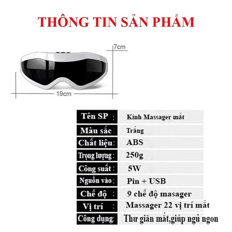 Chăm Sóc Đôi Mắt Tốt Hơn: Việc sử dụng máy massage mắt thường xuyên sẽ giúp bạn duy trì sức khỏe cho đôi mắt, ngăn ngừa các vấn đề liên quan đến mỏi mắt và mờ mắt. Thông Số Kỹ Thuật: