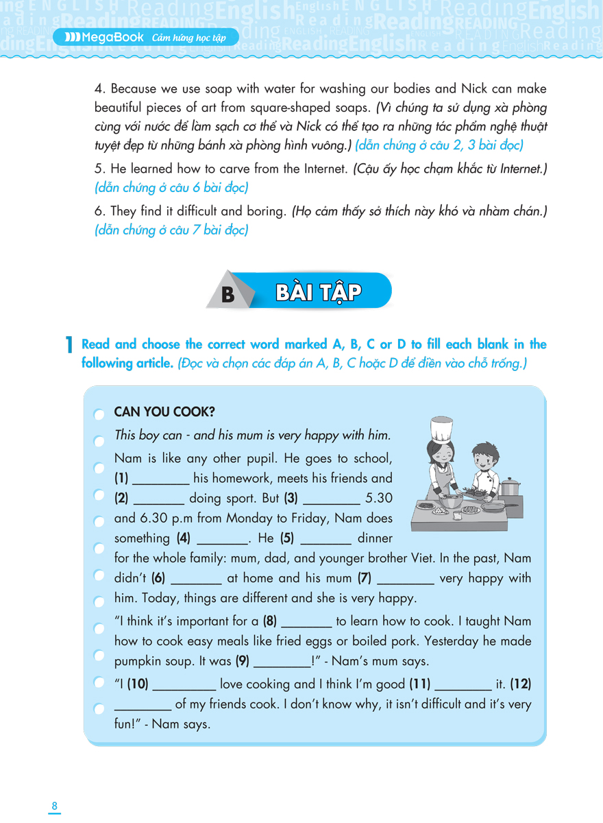 Cuốn sách giúp các em nắm vững kiến thức đã học trên lớp cũng như ôn luyện thêm các bài tập nâng cao, hỗ trợ quá trình tự học tiếng Anh hiệu quả, giới thiệu các kỹ năng đọc hiểu với hướng dẫn từng bước cụ thể, giúp học sinh dễ dàng ghi nhớ và vận dụng.