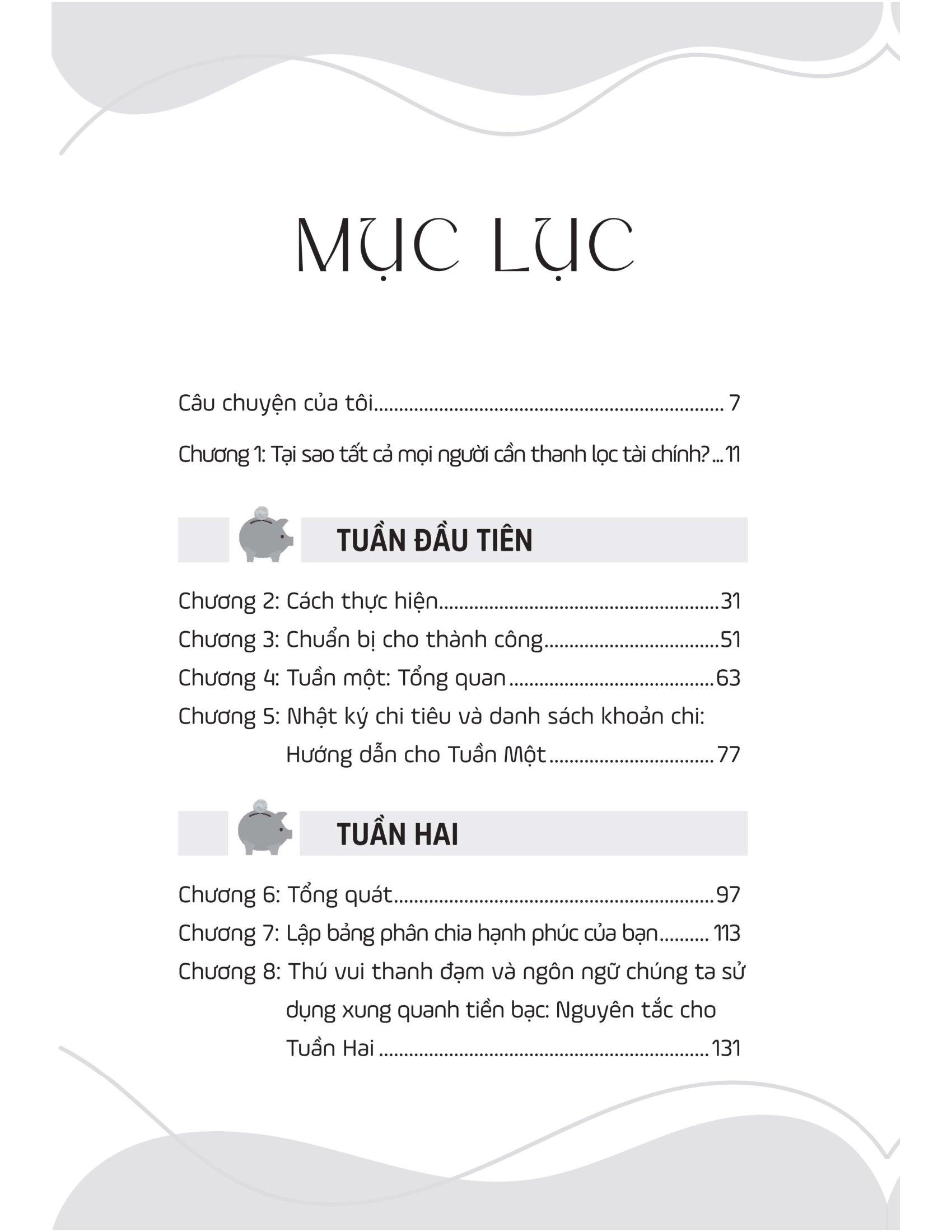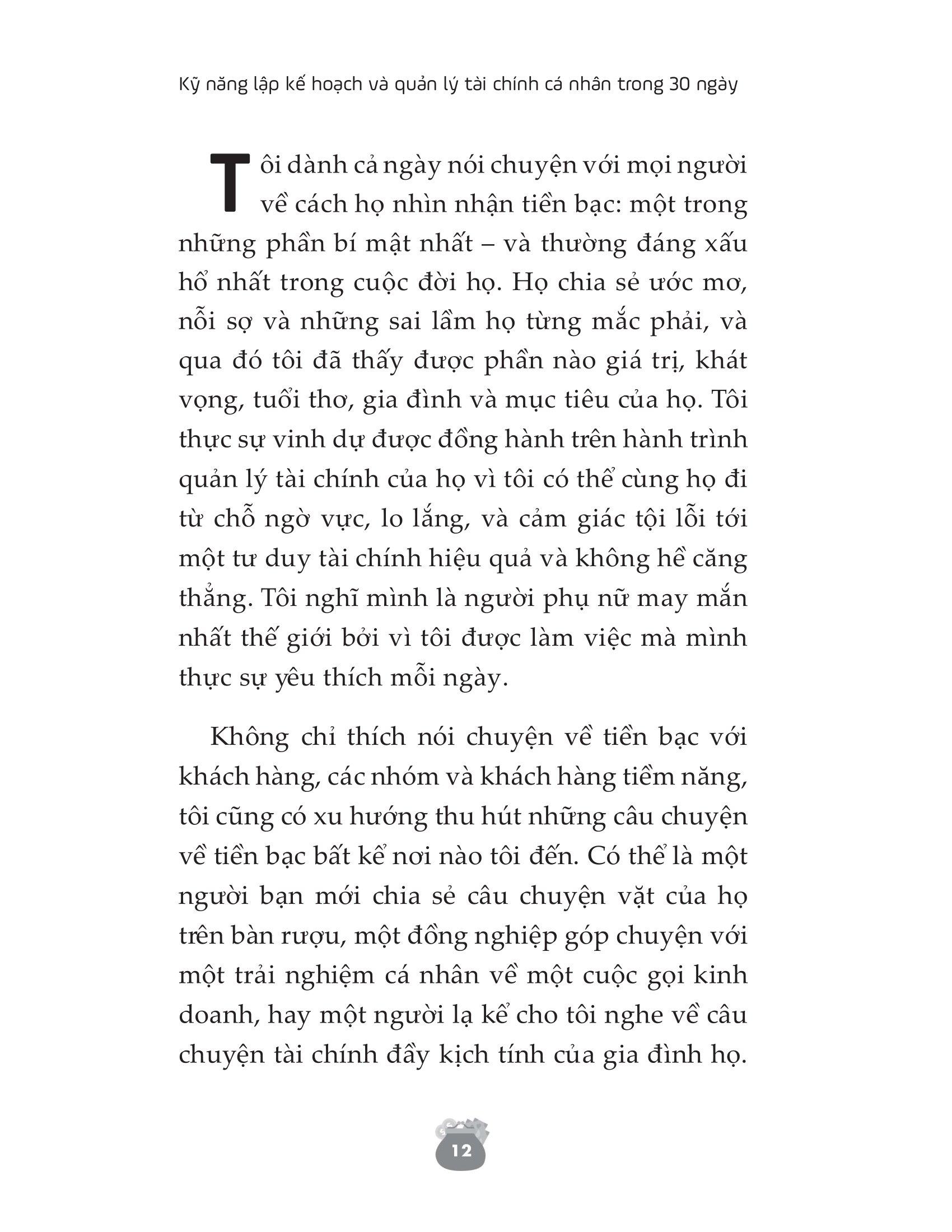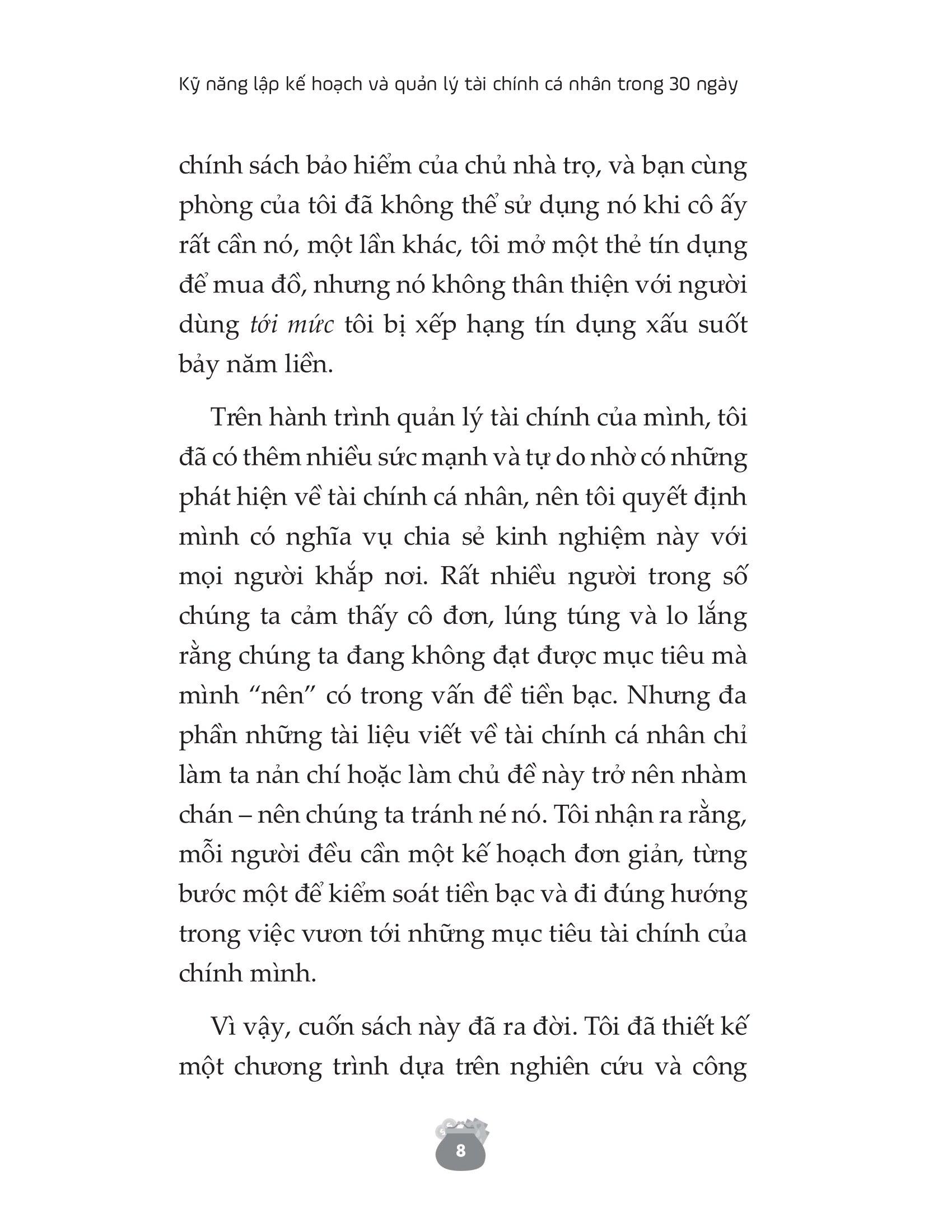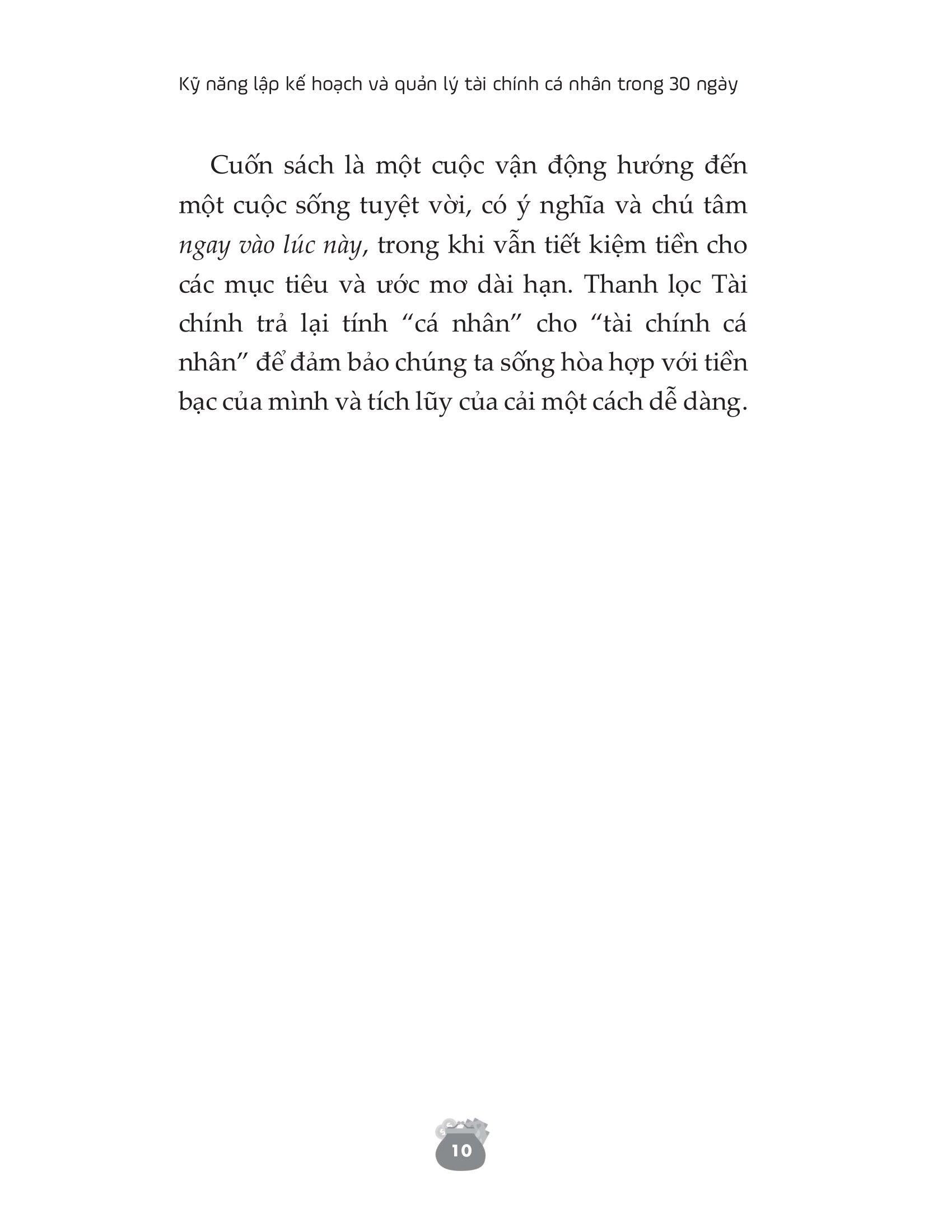 Bằng chương trình Thanh lọc Tài Chính trong 30 ngày, Kỹ năng lập kế hoạch và quản lý tài chính cá nhân trong 30 ngày giúp bạn định hình lại cách chi tiêu, thay đổi tư duy về tiền bạc và đảm bảo phương pháp quản lý tài chính cá nhân hiệu quả. Cuốn sách chính là cứu cánh cho mối quan hệ không mấy tốt đẹp của bạn với tiền bạc và giúp bạn vạch ra một kế hoạch chi tiêu để có thể vẫn vui vẻ mà không tốn kém. Lối tư duy tích cực và đúng đắn về tiền bạc mà tác giả đưa ra sẽ nhanh chóng hỗ trợ bạn hoàn thành các mục tiêu mà bạn mong muốn nhất trong đời.