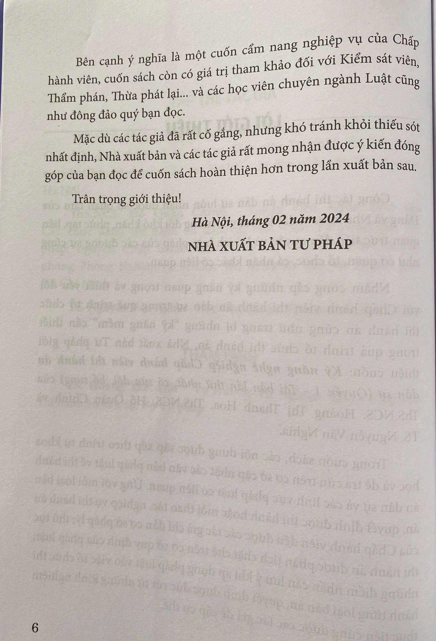 Nhà Xuất bản Tư pháp và Nhóm tác giả: Ths. GV.Hoàng Thị Thanh Hoa, Ths. Hồ Quân Chính, TS. Nguyễn Văn Nghĩa xin trân trọng giới thiệu tới Quý bạn đọc cuốn sách mới “Kỹ năng nghề nghiệp Chấp hành viên Thi hành án Dân sự” Đây là cuốn sách chứa đựng những kỹ năng quan trọng và thiết yếu có giá trị tham khảo và ứng dụng cao đối với Chấp hành viên Thi hành án Dân sự trong quá trình tổ chức thi hành án. Cuốn sách dày 600 trang, kết cấu được xây dựng bám theo thủ tục THADS trên cơ sở cập nhật tất cả các văn bản pháp luật về THADS và các lĩnh vực pháp luật khác có liên quan được áp dụng đối với từng thủ tục một cách chi tiết giúp người đọc dễ dàng tra cứu. Những giá trị quý báu mà cuốn sách mang đến cho bạn đọc: ứng với mỗi tác nghiệp của Chấp hành viên đều được chỉ rõ cơ sở pháp lý; thủ tục thi hành án được phân tích chặt chẽ trên cơ sở quy định của pháp luật; cùng với những điểm nhấn cần lưu ý khi áp dụng pháp luật và những kinh nghiệm thực tiễn vào việc tổ chức thi hành án; trang bị những “kỹ năng mềm” cần thiết trong quá trình tổ chức thi hành án. Bên cạnh ý nghĩa là một cuốn sách “kỹ năng nghề” của Chấp hành viên, cuốn sách còn có giá trị tham khảo đối với những người làm công việc chuyên ngành Tư pháp như Kiểm sát viên, Thẩm phán, Thừa phát lại… và các học viên chuyên ngành Luật cũng như đông đảo Quý độc giả. Nhóm tác giả hy vọng cuốn sách “Kỹ năng nghề nghiệp Chấp hành viên thi hành án dân sự” sẽ là người bạn đồng hành tin cậy đối với đồng nghiệp công tác trong hệ thống Thi hành án dân sự và đông đảo Quý bạn đọc quan tâm!