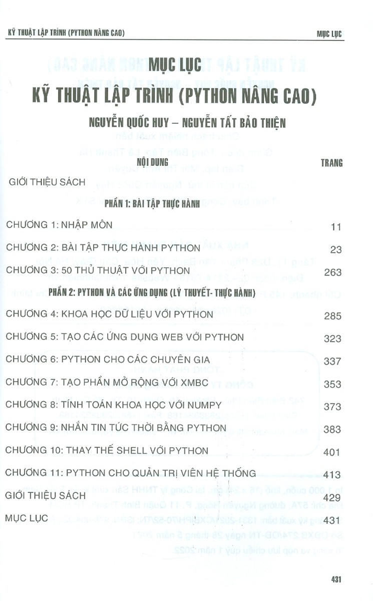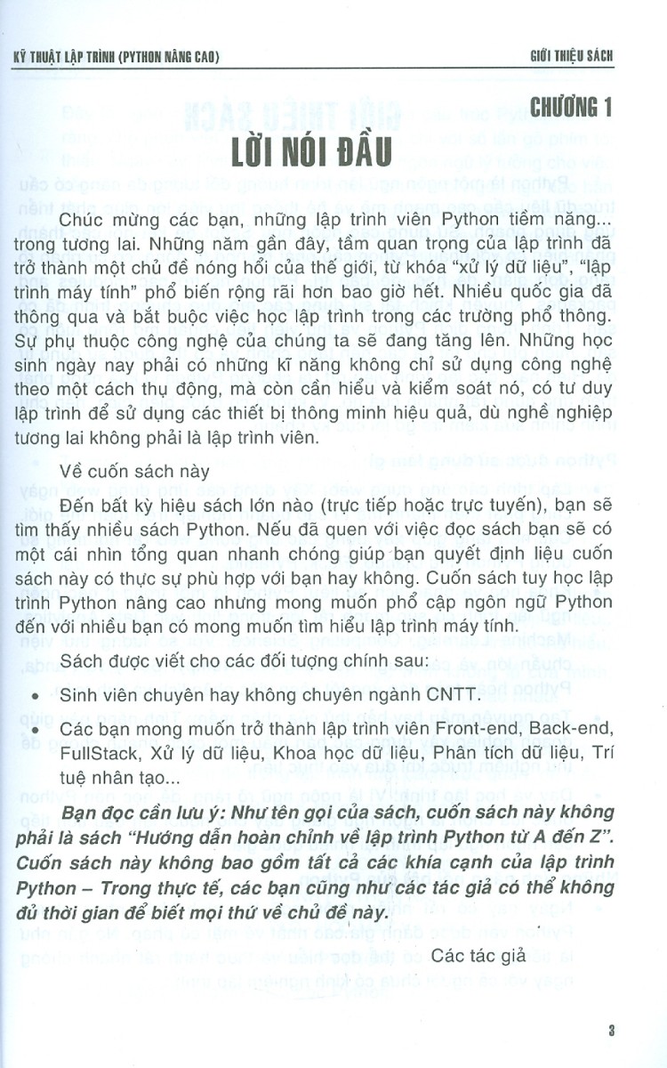 Mua tại TiktokKỹ Thuật Lập Trình Python Nâng Cao Về cuốn sách này Đến bất kỳ hiệu sách lớn nào (trực tiếp hoặc trực tuyến), bạn sẽ tìm thấy rất nhiều sách Python. Nếu đã quen với việc đọc sách bạn sẽ có một cái nhìn tổng quan nhanh chóng giúp bạn quyết định liệu cuốn sách này có thực sự phù hợp với bạn hay không. Cuốn sách này mong muốn phổ cập ngôn ngữ Python đến với nhiều bạn có mong muốn tìm hiểu lập trình máy tính. Sách được viết cho các đối tượng chính sau: Không yêu cầu người học có kinh nghiệm lập trình trước đó. Học sinh phổ thông. Sinh viên chuyên hay không chuyên ngành CNTT. Các bạn mong muốn trở thành lập trình viên Front-end, Back-end,