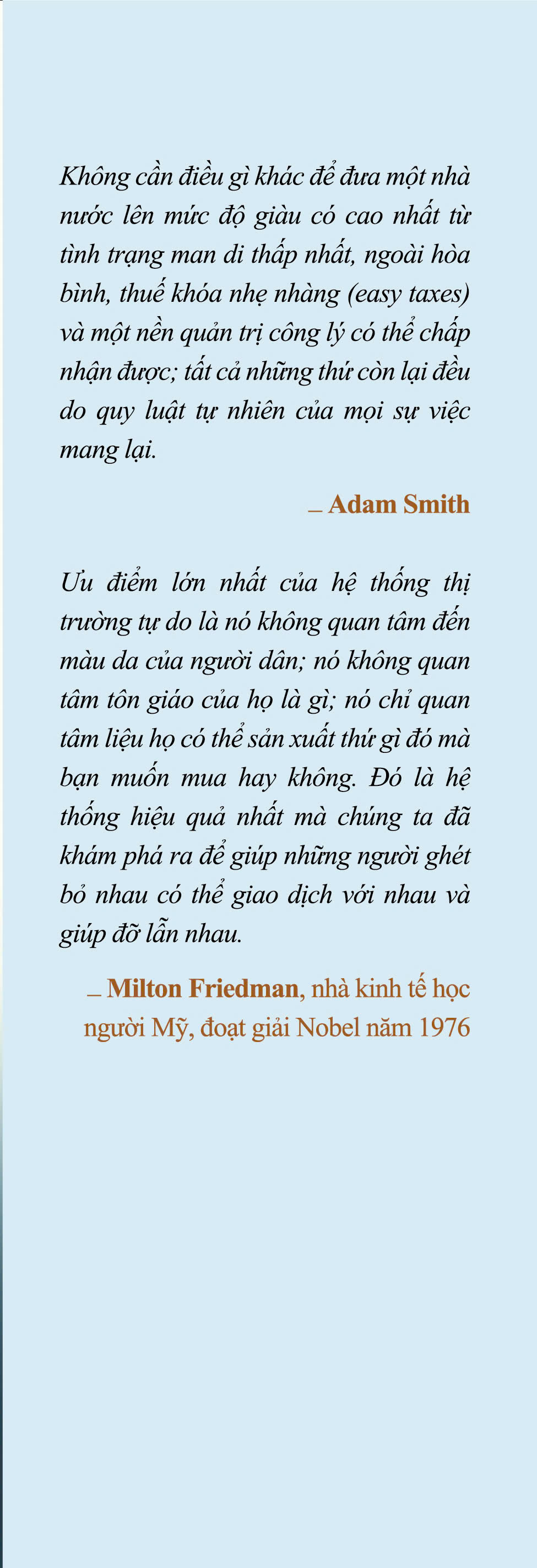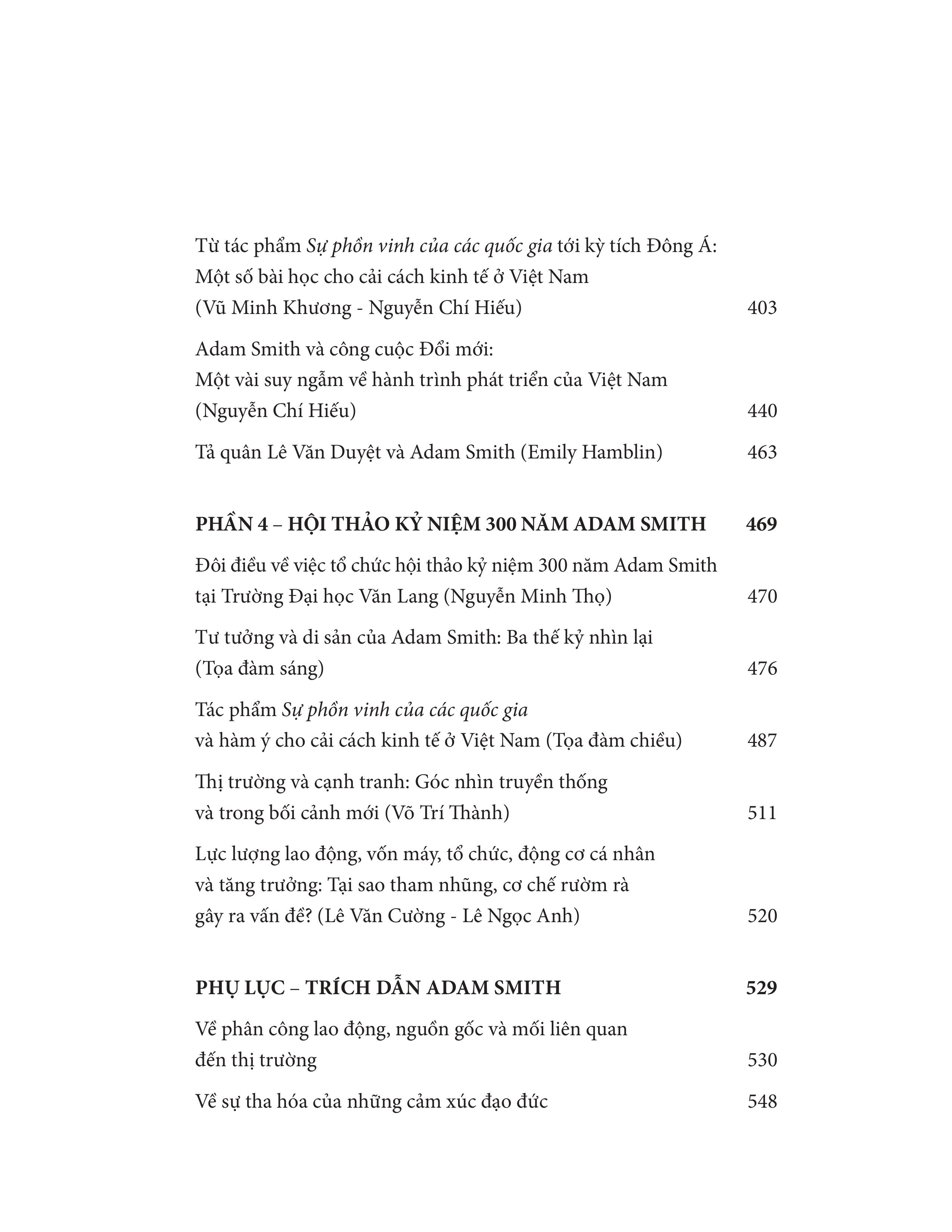 Kỷ yếu 300 năm Adam Smith (1723-2023) - Người đặt nền tảng của kinh tế học phồn vinh là cuốn sách được ra đời để kỷ niệm 300 năm ngày sinh của “cha đẻ” kinh tế học hiện đại Adam Smith (1723-2023), do Phanbook và NXB Đà Nẵng ấn hành. Đây là quyển sách đầu tiên về diện mạo và những đóng góp của ông cho lý thuyết kinh tế thế giới, do Trần Quốc Hùng - Trần Văn Thọ - Nguyễn Xuân Xanh chủ biên, với sự cộng tác, tham gia chấp bút của Nguyễn Chí Hiếu - Nguyễn Minh Thọ - Trần Lê Anh - Nguyễn Ngọc Anh - Nguyễn Tú Anh - Lê Văn Cường - Lê Đăng Doanh - Huỳnh Thế Du - Edmund Malesky - Emily Hamblin - Vũ Minh Khương - Hoàng Hải Vân…    Cuốn sách có 4 phần:  Phần 1 - Adam Smith: Con người và tư tưởng Phần 2 - Adam Smith và thế giới Phần 3 - Adam Smith nhìn từ Việt Nam Phần 4 - Hội thảo kỷ niệm 300 năm Adam Smith.  Cùng với đó là phần Phụ lục trích dịch 2 tác phẩm quan trọng nhất của ông - Sự phồn vinh của các quốc gia và Lý thuyết về tình cảm đạo đức. Trong gần 600 trang sách, các tác giả đã phác họa lại cuộc đời, bối cảnh lịch sử thời Adam Smith sinh sống, những yếu tố góp phần hun đúc nên tư tưởng quan trọng của ông; bên cạnh đó, các tác giả đã phóng chiếu, bàn sâu về sự ảnh hưởng của ông lên lý thuyết kinh tế thế giới, cho thấy tư tưởng vượt thời cùng những cấp tiến bên trong bộ óc lỗi lạc.