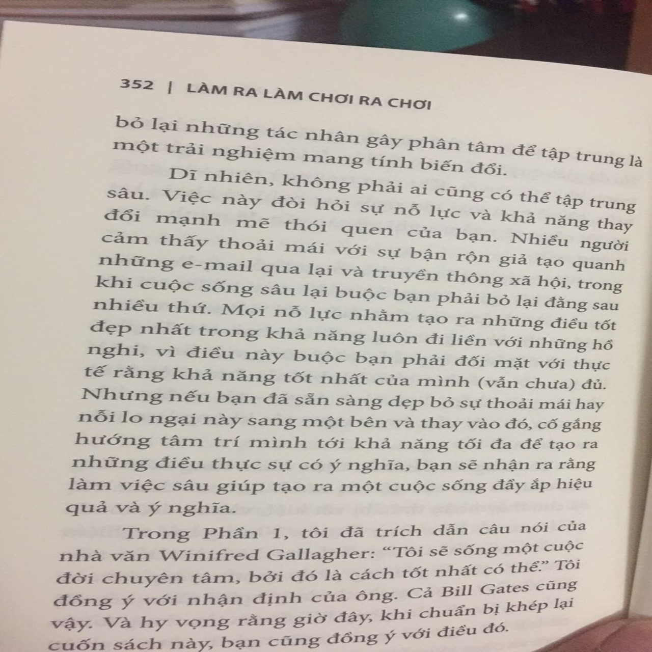 Đã bao giờ bạn ngồi xuống để làm việc và sau đó, không hề nhận ra mình lại kết thúc bằng việc dành một (vài) tiếng đồng hồ lướt Youtube, Fa.cebook, tin tức? Tất cả chúng ta đều đã từng làm vậy. Có vẻ như có quá nhiều thứ lôi kéo sự chú ý của chúng ta trong thời đại này, nên rất khó để thậm chí đạt đến trạng thái tinh thần giúp hoàn thành công việc một cách tốt nhất. Trong Làm ra làm chơi ra chơi, tác giả Cal Newport nhấn mạnh chủ đề “làm việc sâu” (deep work) đang ngày càng được chú trọng. Học cách làm thế nào để làm việc sâu – khả năng tập trung vào một nhiệm vụ khó nhằn mà không hề bị sao lãng – là chìa khóa để tạo ra những kết quả tốt hơn trong thời gian ngắn hơn. Cuốn sách đưa ra hai mục tiêu, được chia làm hai phần. Phần 1 nhằm thuyết phục bạn rằng giả thiết về làm việc sâu là đúng. Phần 2 giới thiệu đến bạn một số cách để tận dụng làm việc sâu bằng cách rèn luyện não bộ và chuyển đổi thói quen làm việc sang hướng đặt làm việc sâu ở trung tâm sự nghiệp.