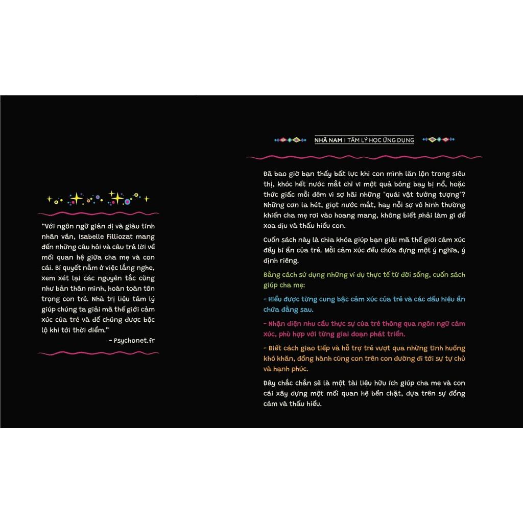Đã bao giờ bạn thấy bất lực khi con mình lăn lộn trong siêu thị, khóc hết nước mắt chỉ vì một quả bóng bay bị nổ, hoặc thức giấc mỗi đêm vì sợ hãi những "quái vật tưởng tượng"? Những cơn la hét, giọt nước mắt, hay nỗi sợ vô hình thường khiến cha mẹ rơi vào hoang mang, không biết phải làm gì để xoa dịu và thấu hiểu con. Cuốn sách này là chìa khóa giúp bạn giải mã thế giới cảm xúc đầy bí ẩn của trẻ. Mỗi cảm xúc đều chứa đựng một ý nghĩa, ý định riêng. Bằng cách sử dụng những ví dụ thực tế từ đời sống, cuốn sách giúp cha mẹ: - Hiểu được từng cung bậc cảm xúc của trẻ và các dấu hiệu ẩn chứa đằng sau. - Nhận diện nhu cầu thực sự của trẻ thông qua ngôn ngữ cảm xúc, phù hợp với từng giai đoạn phát triển. - Biết cách giao tiếp và hỗ trợ trẻ vượt qua những tình huống khó khăn, đồng hành cùng con trên con đường đi tới sự tự chủ và hạnh phúc. - Đây chắc chắn sẽ là một tài liệu hữu ích giúp cha mẹ và con cái xây dựng một mối quan hệ bền chặt, dựa trên sự đồng cảm và thấu hiểu